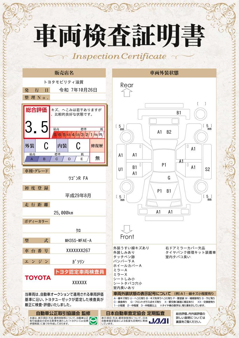車のキズや修復歴などを一目でわかりやすく表示しております。安心して車選びを楽しんでいただくための証明書です。