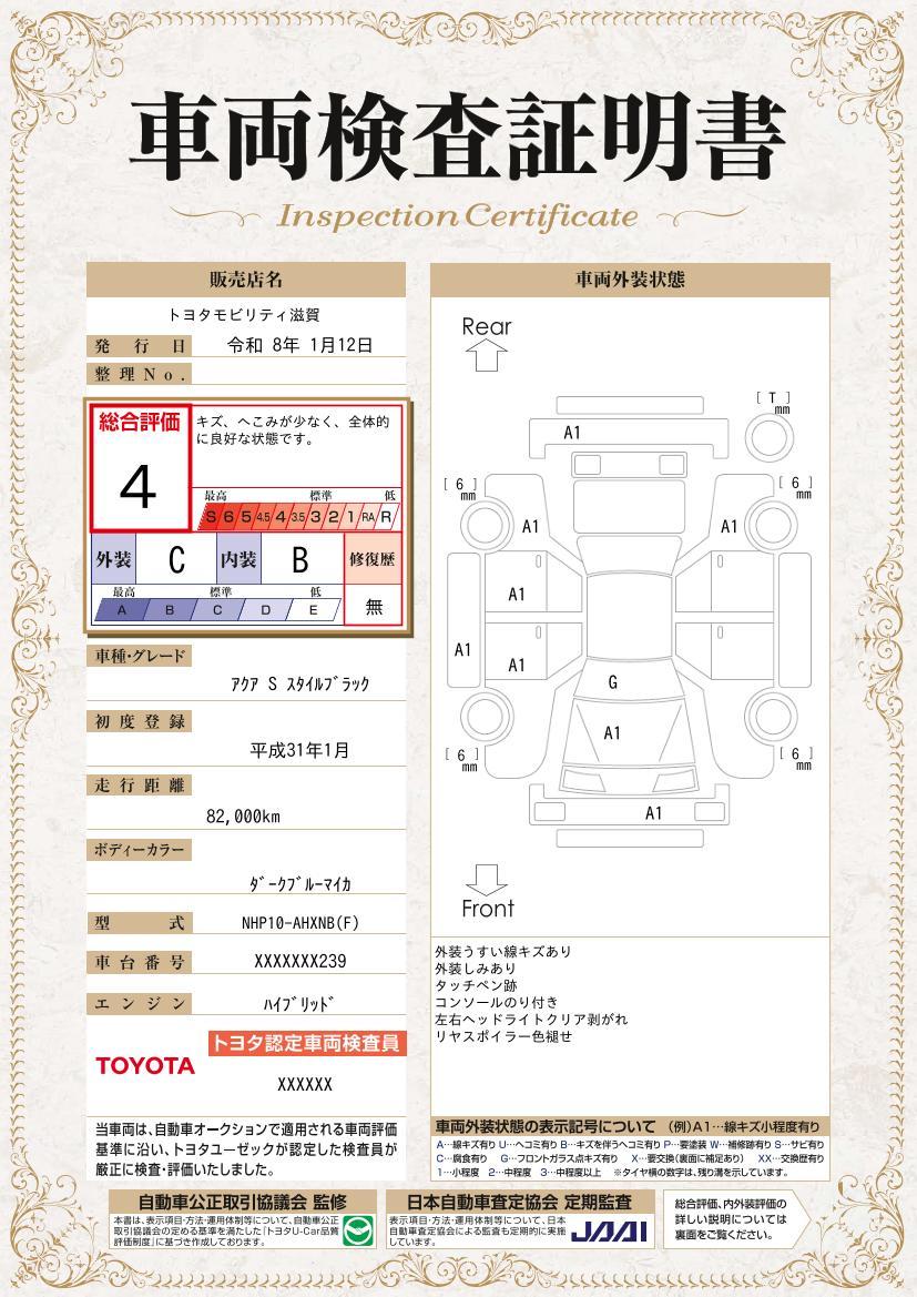 車のキズや修復歴などを一目でわかりやすく表示しております。安心して車選びを楽しんでいただくための証明書です。