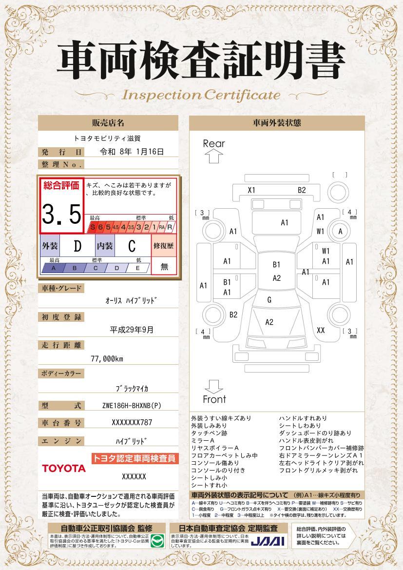 車のキズや修復歴などを一目でわかりやすく表示しております。安心して車選びを楽しんでいただくための証明書です。