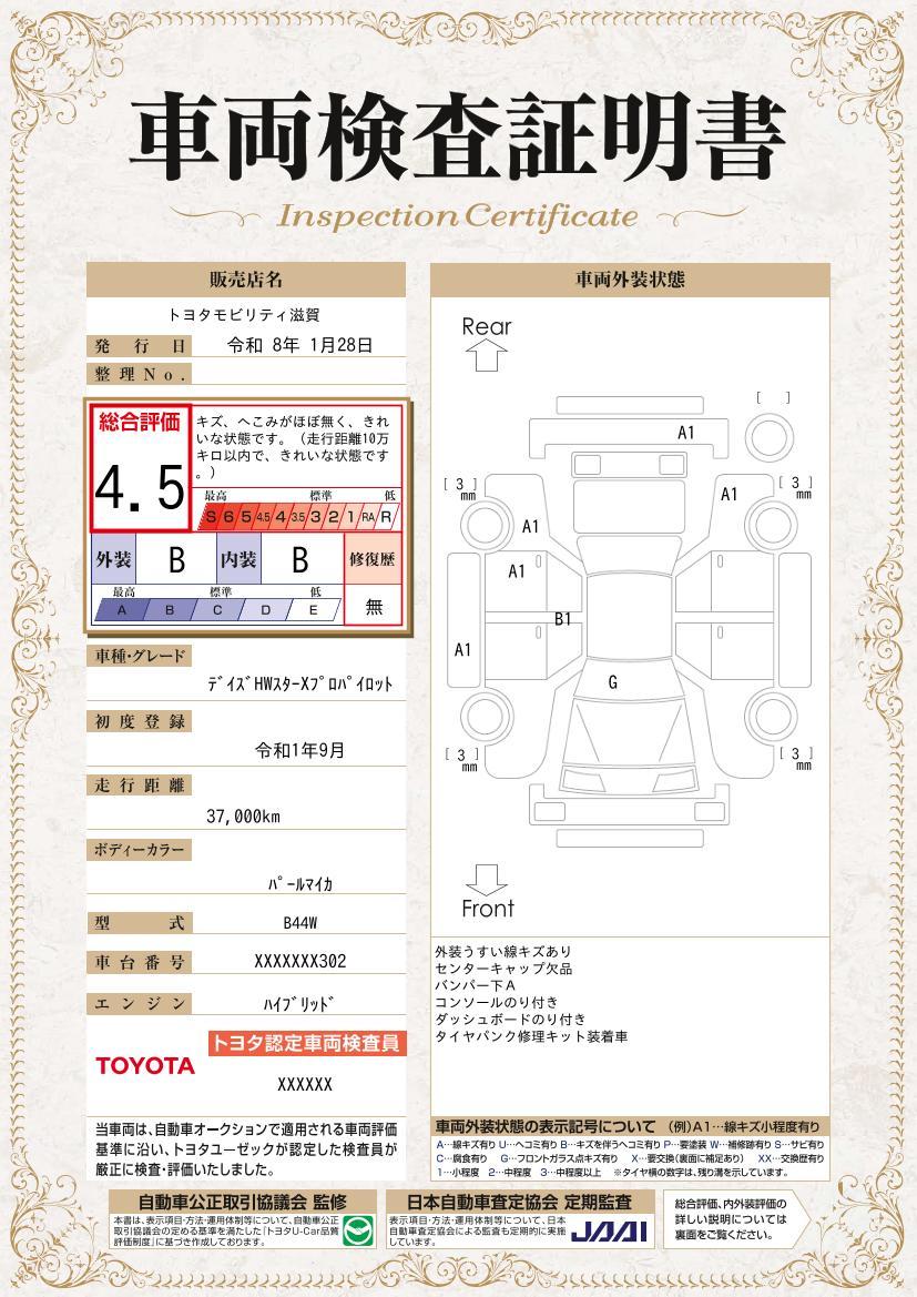 車のキズや修復歴などを一目でわかりやすく表示しております。安心して車選びを楽しんでいただくための証明書です。