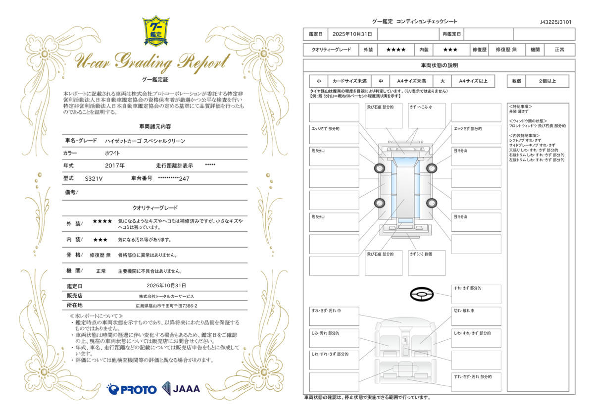 [保証付]:3ヶ月・3000km ※いずれか早い時期が保証適用の条件となります。 ●3か月又は3,000km保証 ●12か月法定点検(初年度登録より12か月未満の車両は6か月点検) ●エンジンオイル交換 ●フロントワイパーゴム交換 ●車検不適合箇所整備 ●現状不具合カ所修理 |
