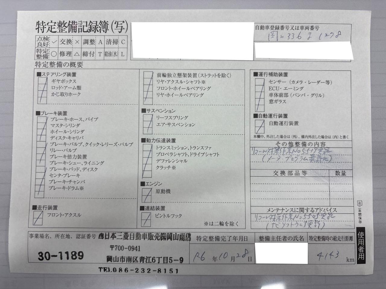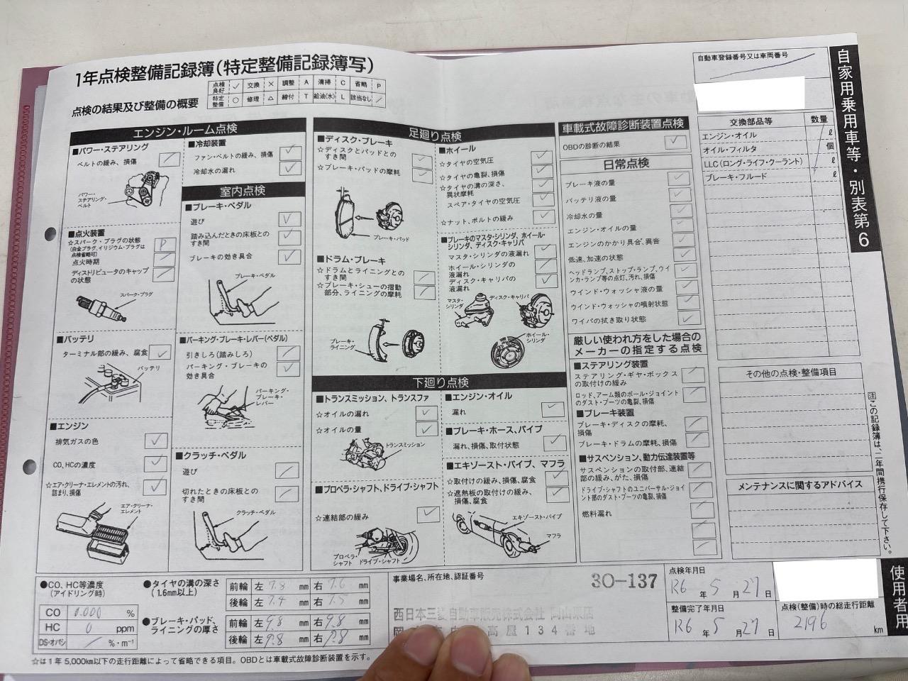 ディーラーにて法定点検を実施し、メーカー保証を継承してご納車させて頂きます(県外のお客様も同様です)初度登録より3年6万キロまで一般保証、初年度登録より5年10万キロまで特別保証をお付けします。