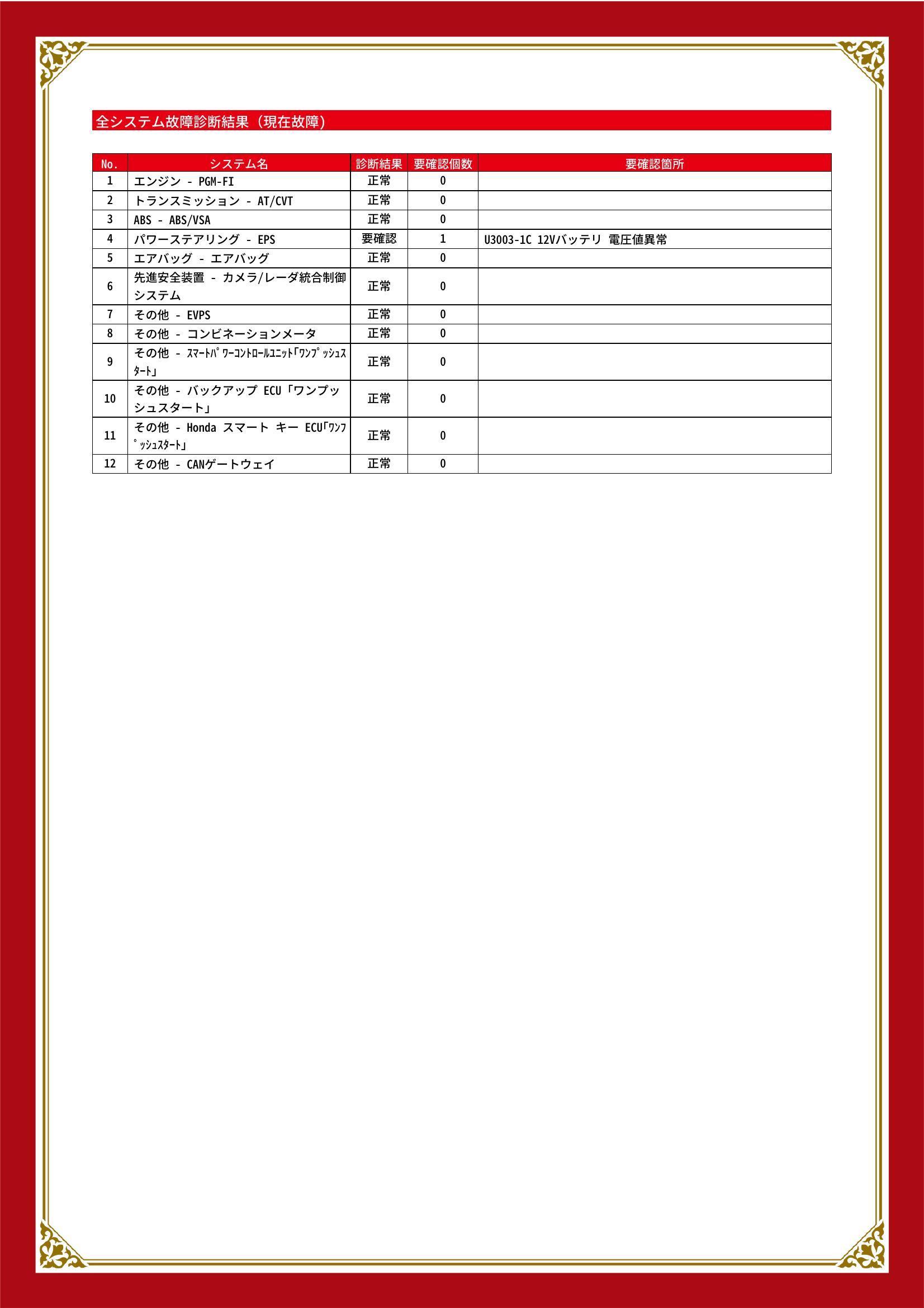 | 保証項目 | 消耗品を除くエンジン・ブレーキ・サスペンション・カーナビ等、保証書に指定した幅広い対象部品を保証します!詳しくはスタッフまで問い合わせください! |