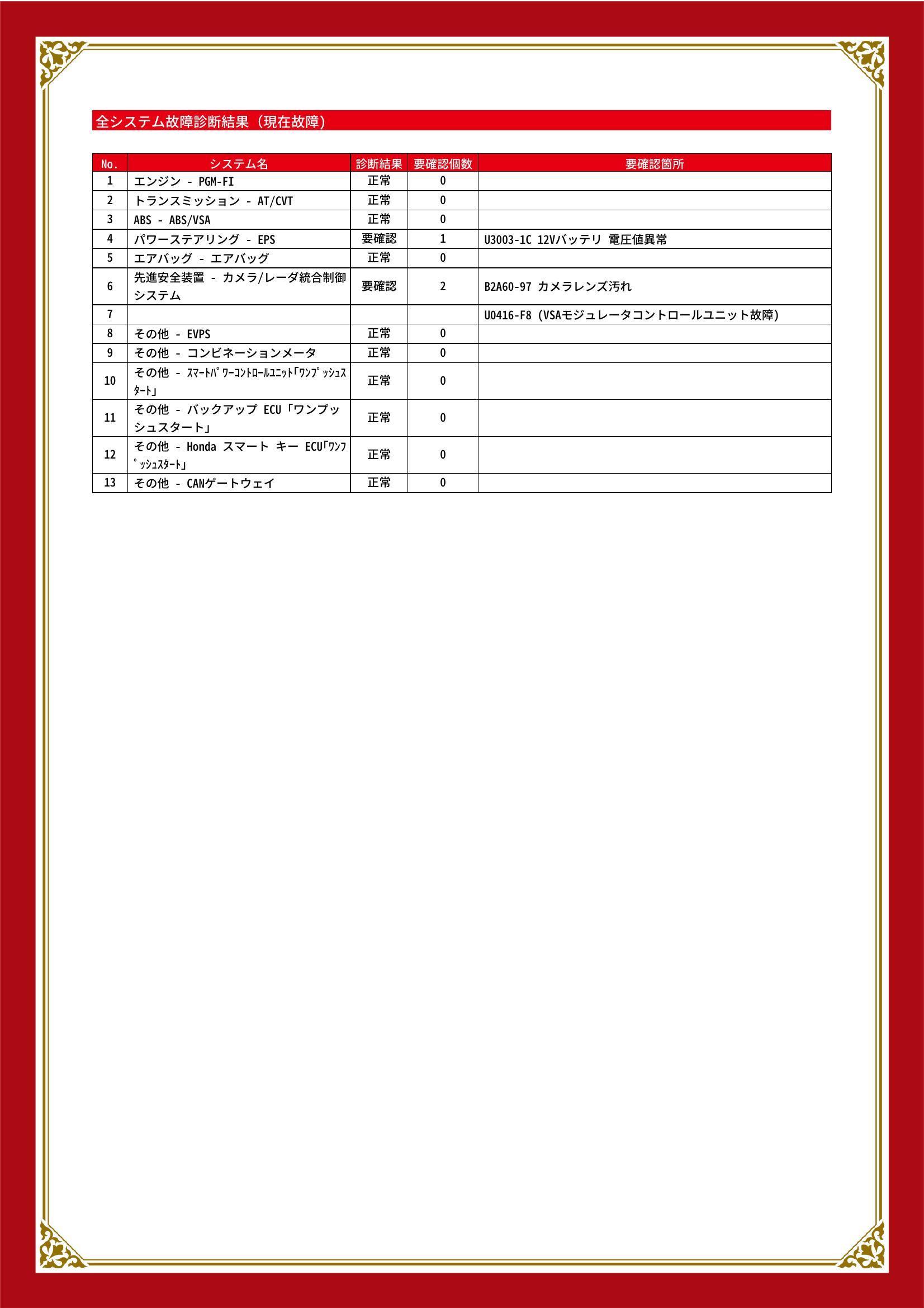 | 保証項目 | 消耗品を除くエンジン・ブレーキ・サスペンション・カーナビ等、保証書に指定した幅広い対象部品を保証します!詳しくはスタッフまで問い合わせください! |