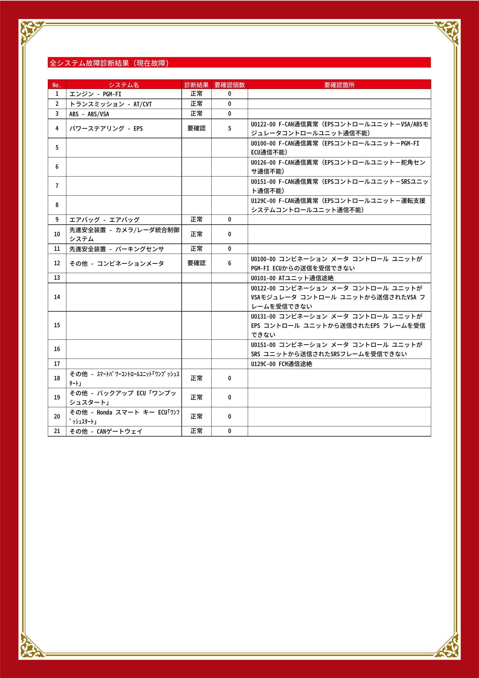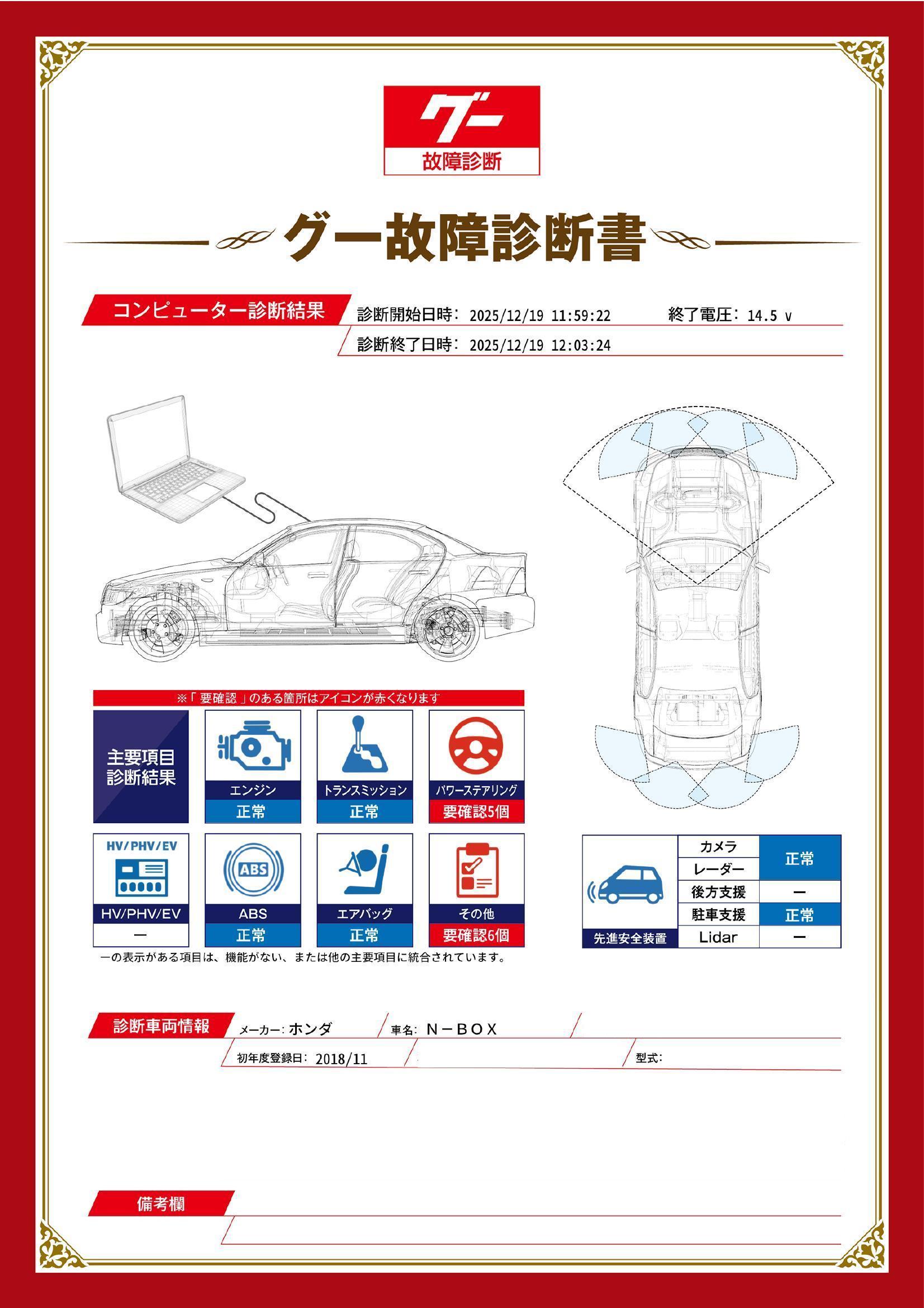 | 保証項目 | 消耗品を除くエンジン・ブレーキ・サスペンション・カーナビ等、保証書に指定した幅広い対象部品を保証します!詳しくはスタッフまで問い合わせください! |