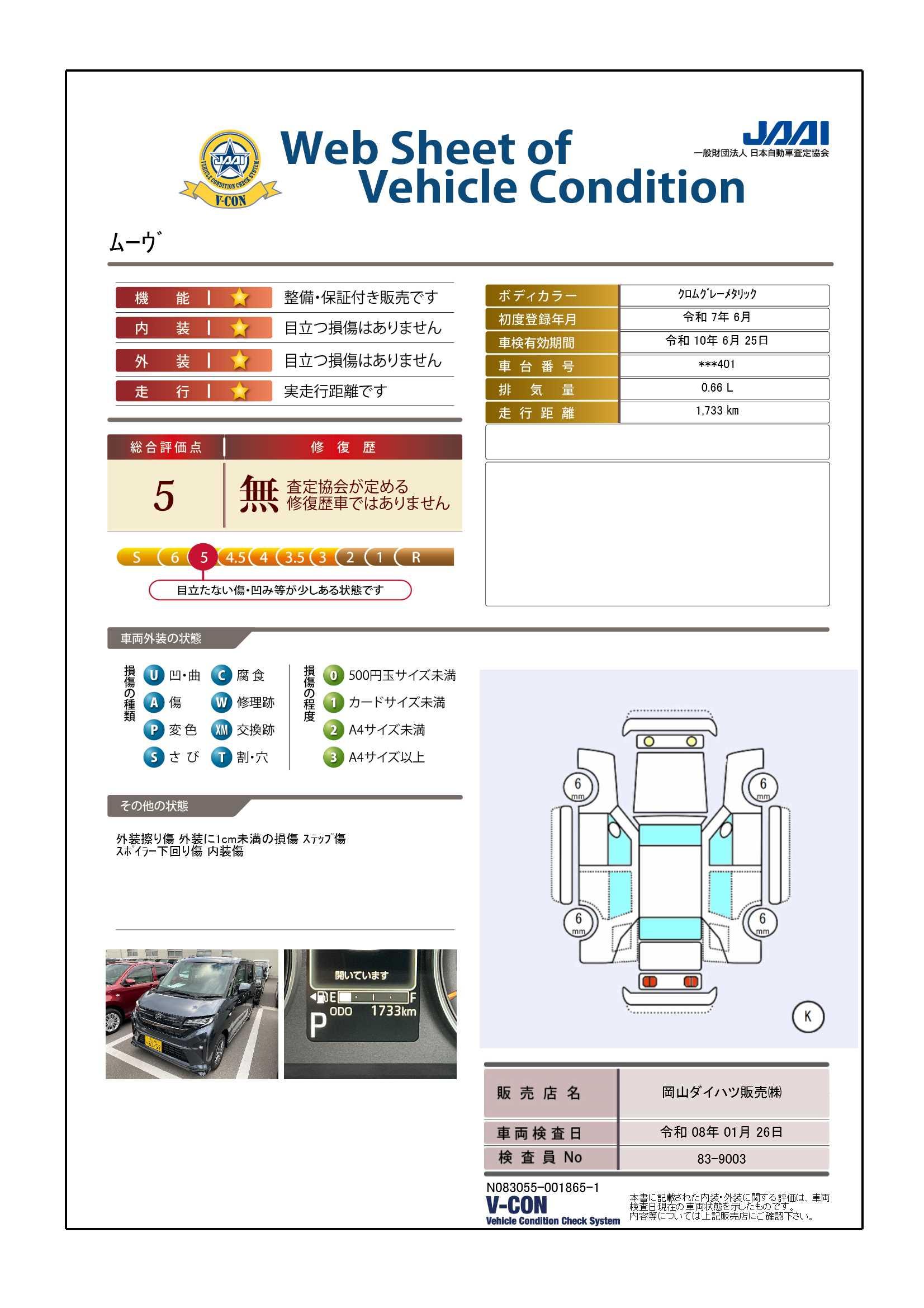 | 保証項目 | 新車メーカー保証に準じた保証(エンジン・エアコン・トランスミッション他)を1年間無償で受けられます。さらに、別途有償保証の「まごころ保証プラス」「まごころ保証プラスα」をご用意しております。 |
