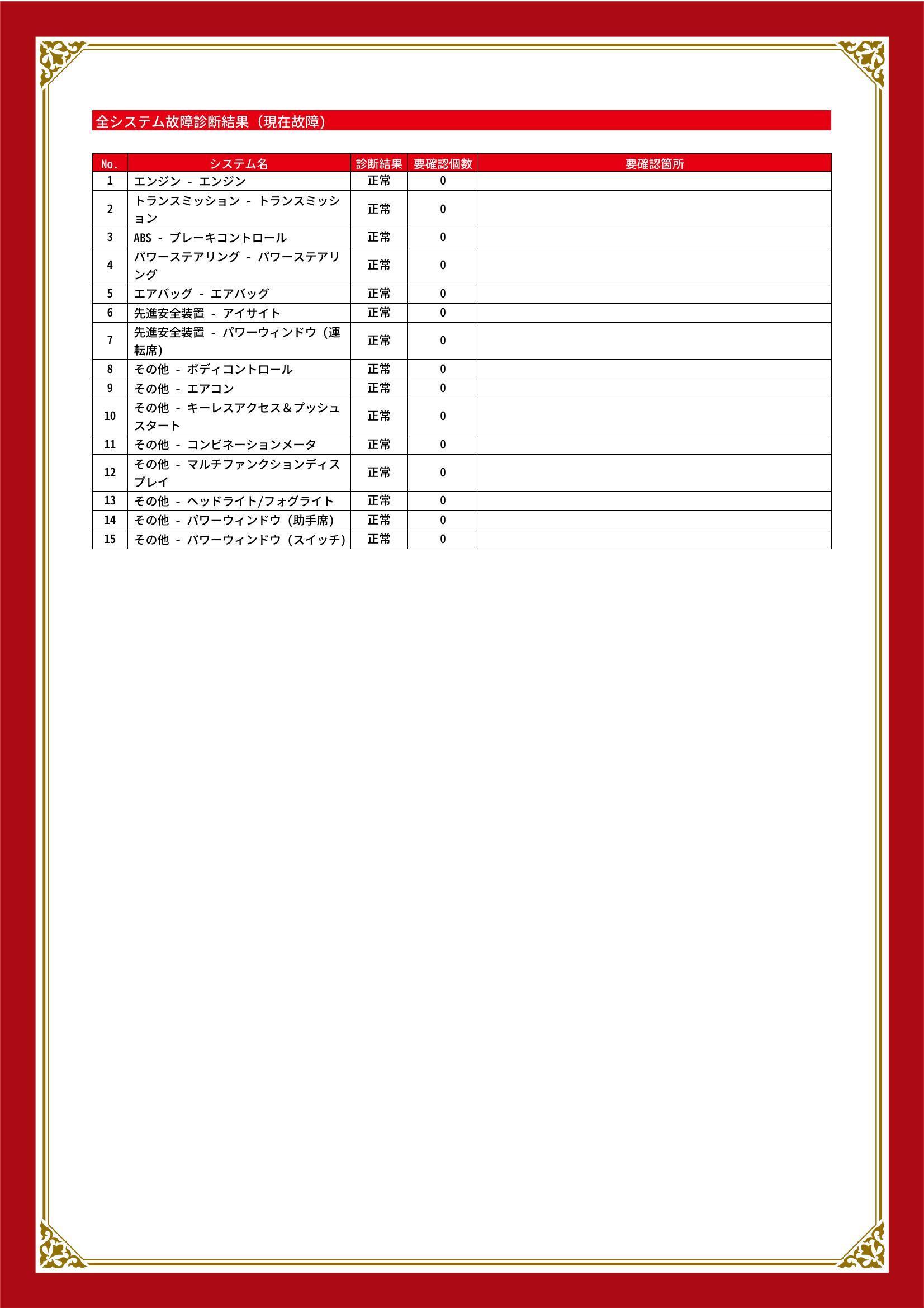 | 保証項目 | 3ヶ月・3000km以内ならエンジン、トランスミッション、ハイブリッド、ステアリング、ブレーキの各機構における主要項目を無償修理(または交換)いたします。 |