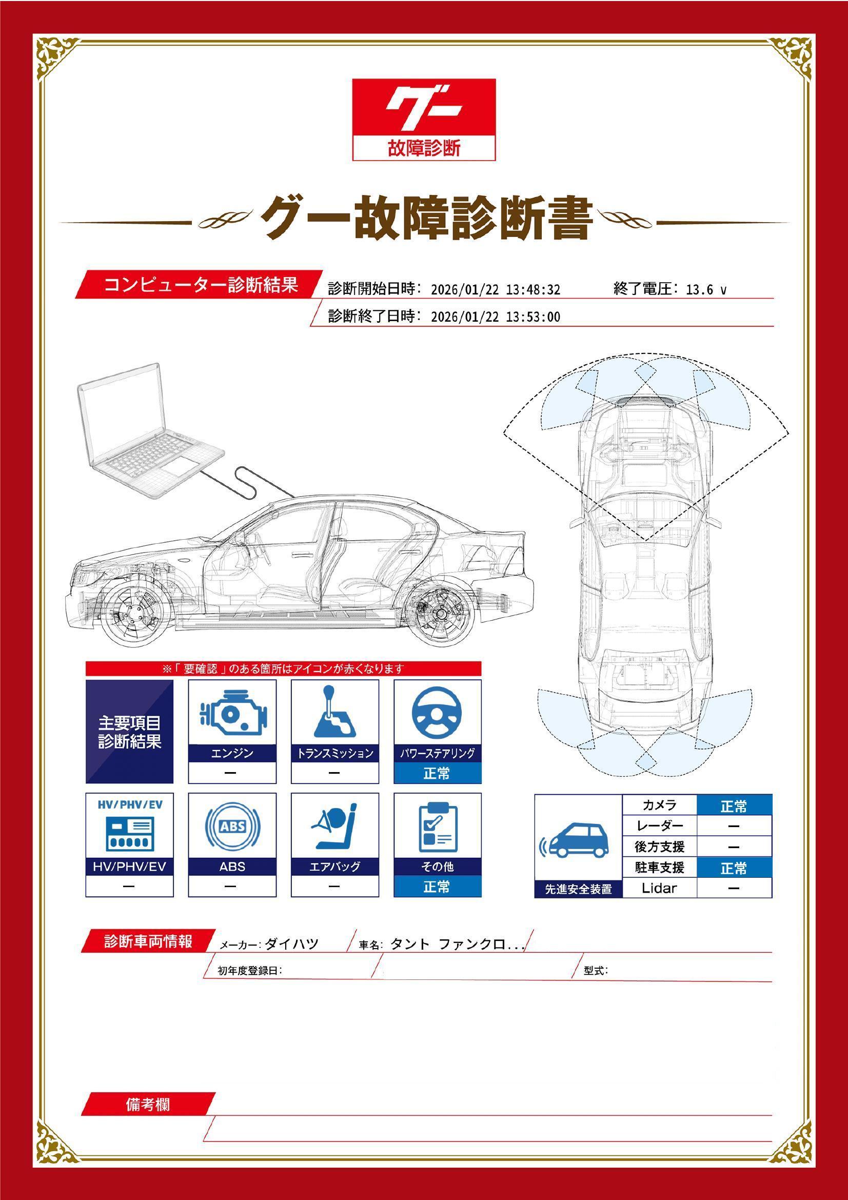 | 保証項目 | 3ヶ月・3000km以内ならエンジン、トランスミッション、ハイブリッド、ステアリング、ブレーキの各機構における主要項目を無償修理(または交換)いたします。 |