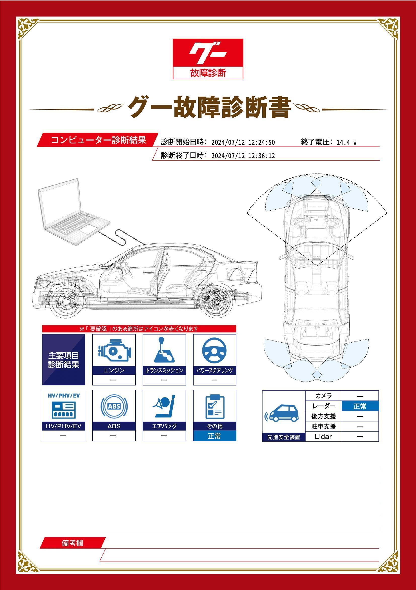 | 保証項目 | 3ヶ月・3000km以内ならエンジン、トランスミッション、ハイブリッド、ステアリング、ブレーキの各機構における主要項目を無償修理(または交換)いたします。 |