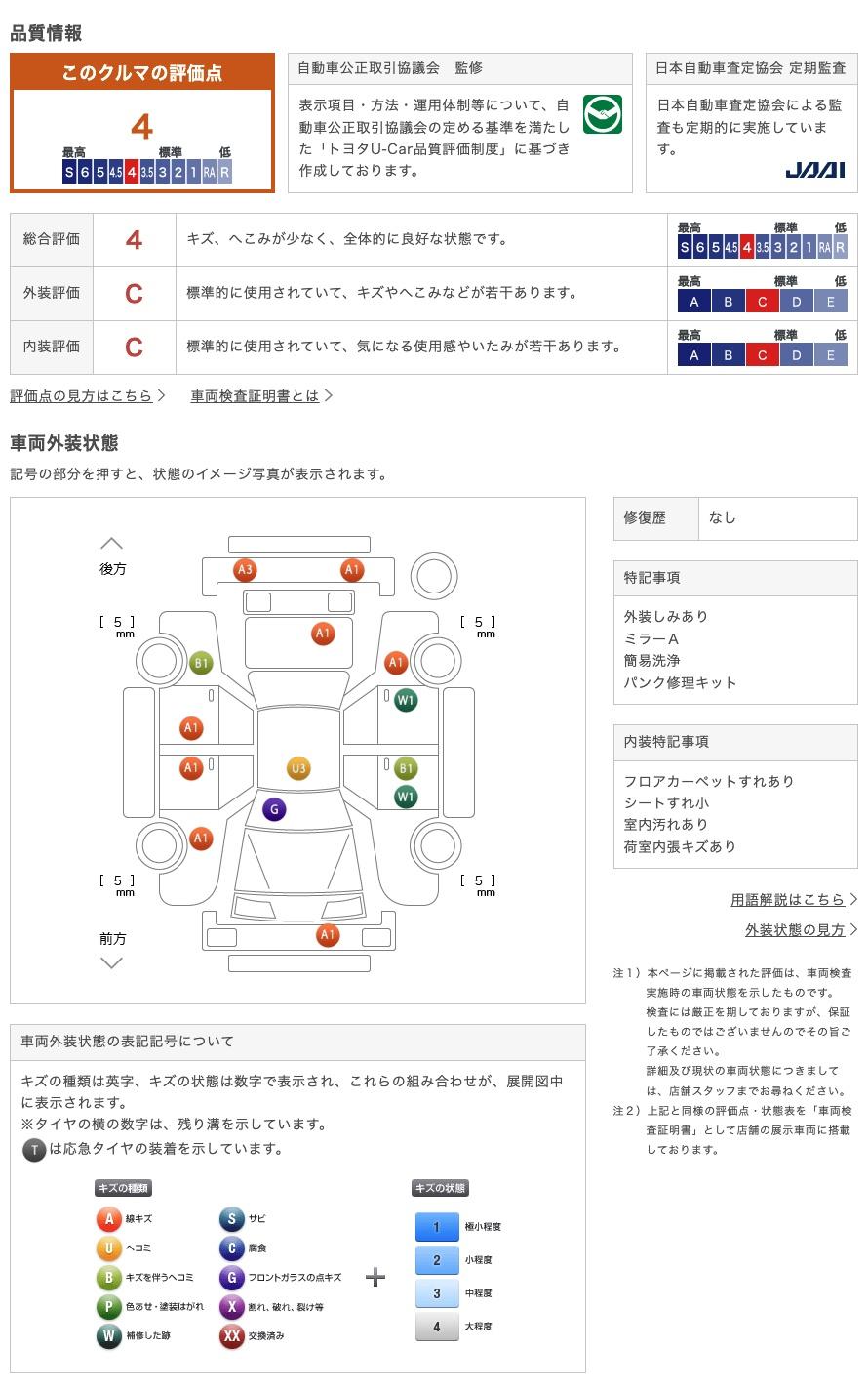 | 保証について | [保証付]:12ヶ月・走行無制限 トヨタロングラン保証付き!12ヶ月・走行無制限保証が付いております。保証内容については、販売店にてお尋ね下さいませ。 |
