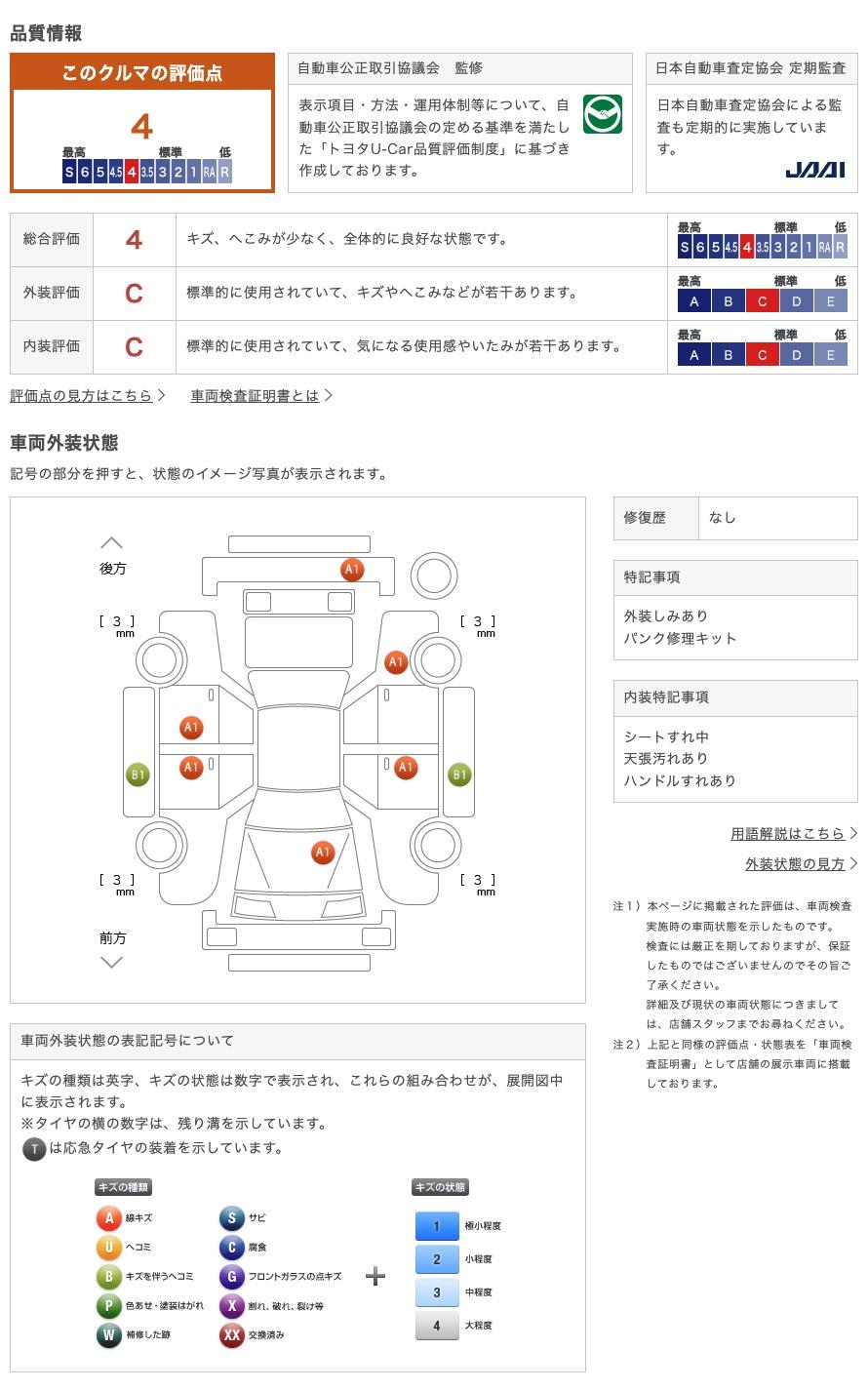 | 保証について | [保証付]:12ヶ月・走行無制限 トヨタロングラン保証付き!12ヶ月・走行無制限保証が付いております。保証内容については、販売店にてお尋ね下さいませ。 |
