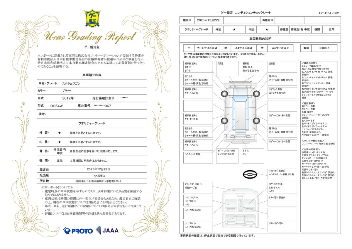 Goo鑑定とは在庫車輌を第三者機関である日本自動車鑑定協会(JAAA)が鑑定し、内装&外装の評価点を5点満点でGoo−net上に開示する事です。そうする事によってお車の情報を明確にし、お客様に信頼をお届け致しております。修復暦の不正表示やメーター改ざん等は一切御座いません。
