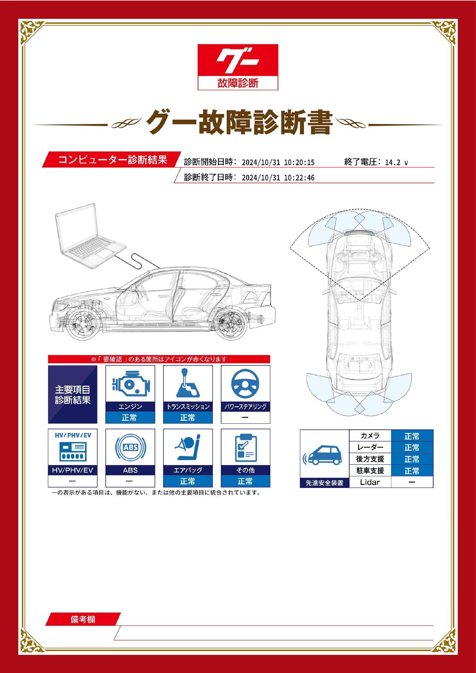 [保証付]:2029(令和11)年9月まで・100000km ※いずれか早い時期が保証適用の条件となります。 お買い上げいただいたお車をディーラーで点検後、お客様のお名前で登録された新車保証書と共に納車いたします。新車を購入された場合と同じ保証内容です!5年間もしくは10万km(※メーカー特別保証の範囲です) |