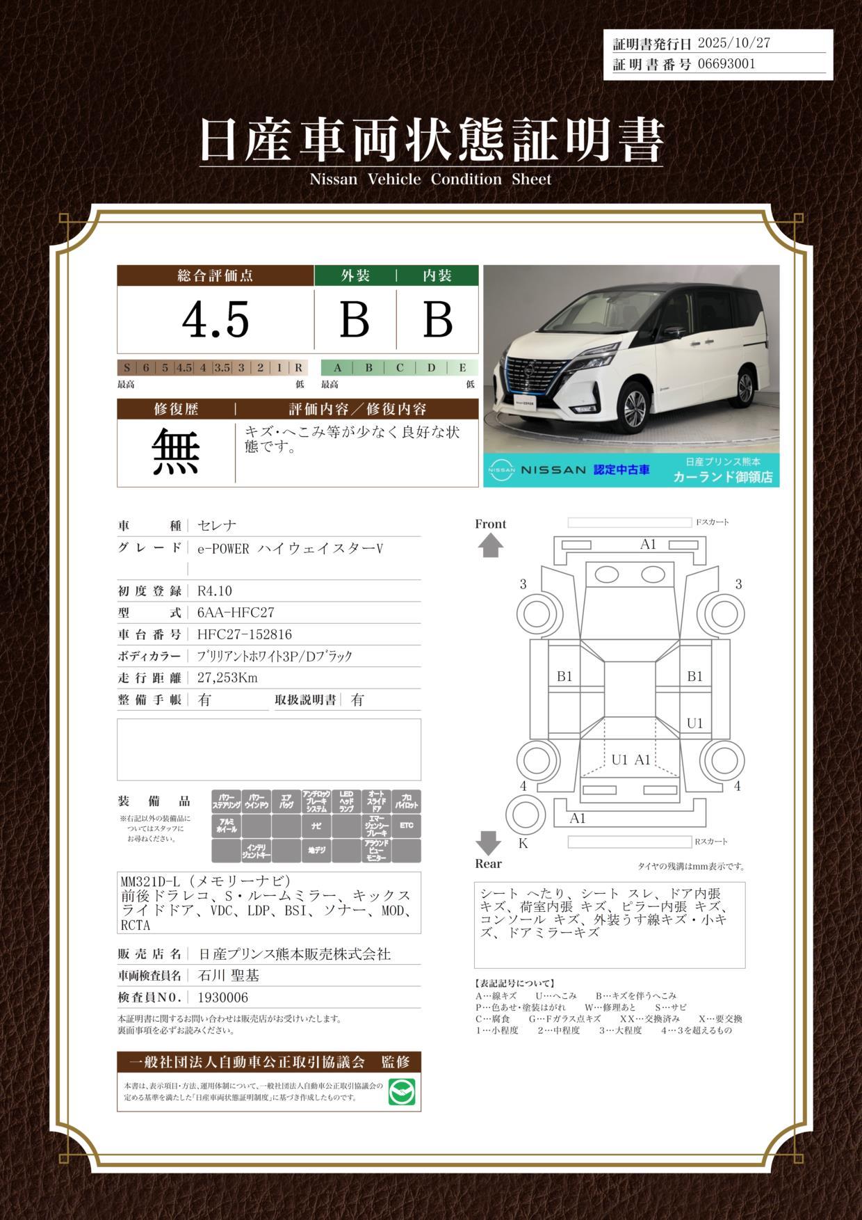 修復歴 なし 車体色 ブリリアントホワイトP/DブラックP