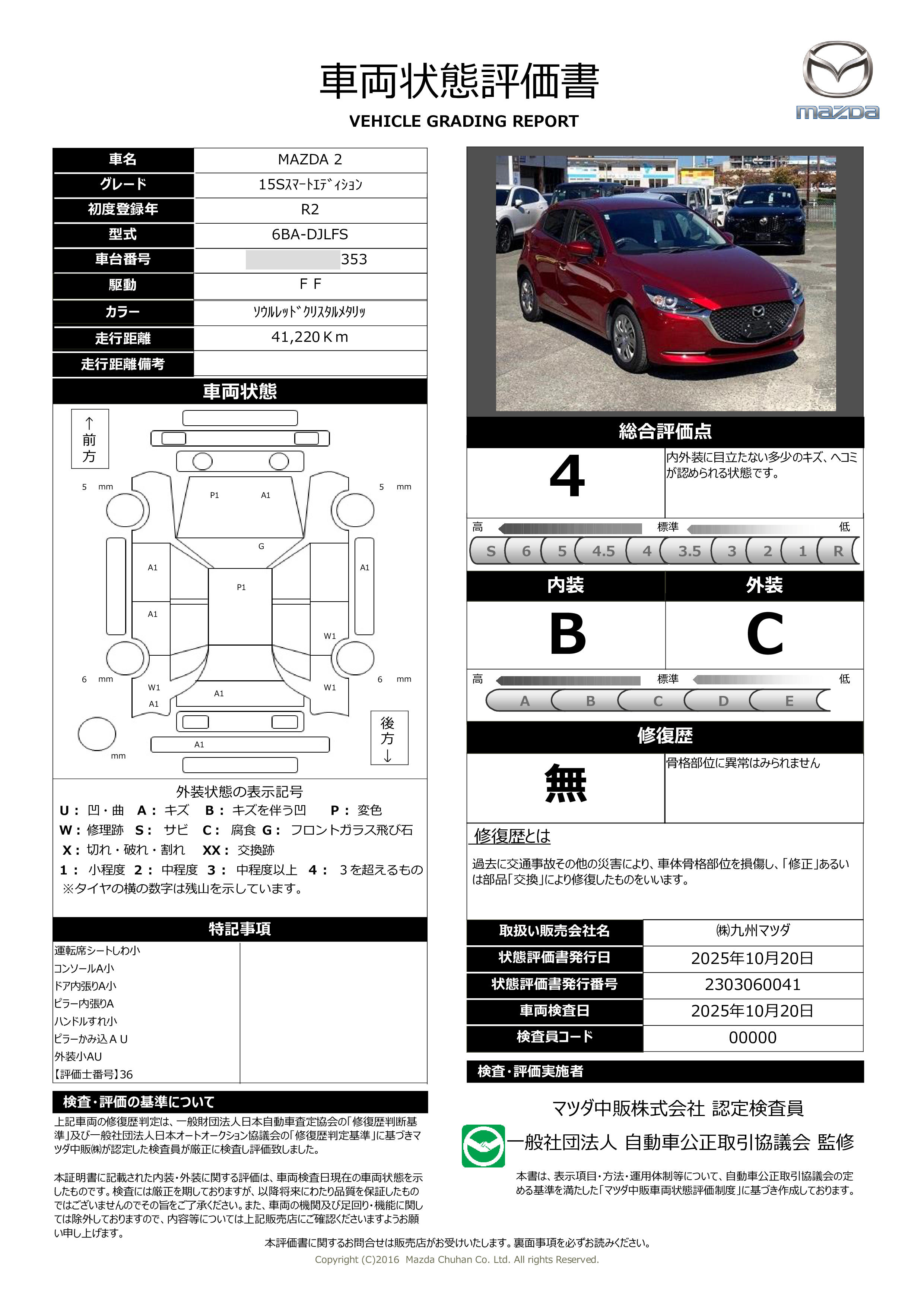 【マツダ認定U−car6つのポイント】1 第三者機関による車両状態評価書の添付 21年間走行距離無制限保証 3定期点検整備実施 47品目の部品交換 (点検の結果十分に良好と確認できた部品は交換しない場合もあります) 51か月無料点検 6マツダ認定U−car認定証の発行
