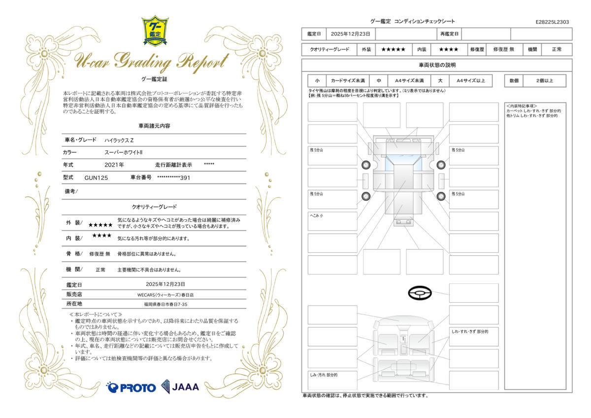 [保証付]:1ヶ月・1000km ※いずれか早い時期が保証適用の条件となります。 納車後1ヶ月・1000km以内は36機構・343項目を保証いたします。詳しくは販売店までお問い合わせ下さい。 |