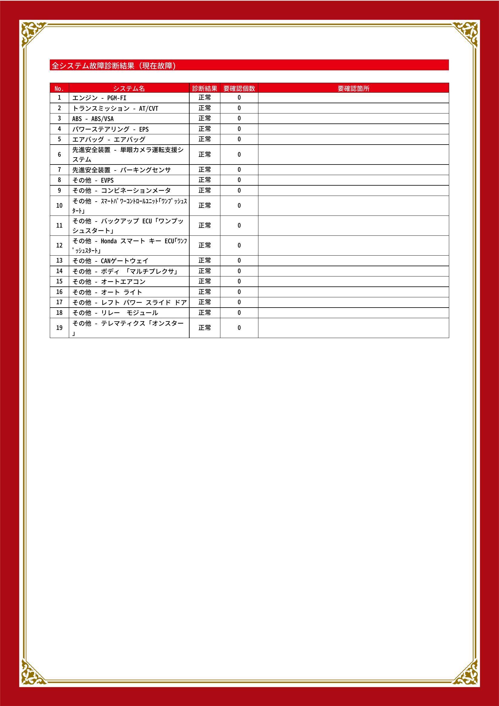 | 保証項目 | 納車後1ヶ月・1000km以内は36機構・343項目を保証いたします。詳しくは販売店までお問い合わせ下さい。 |