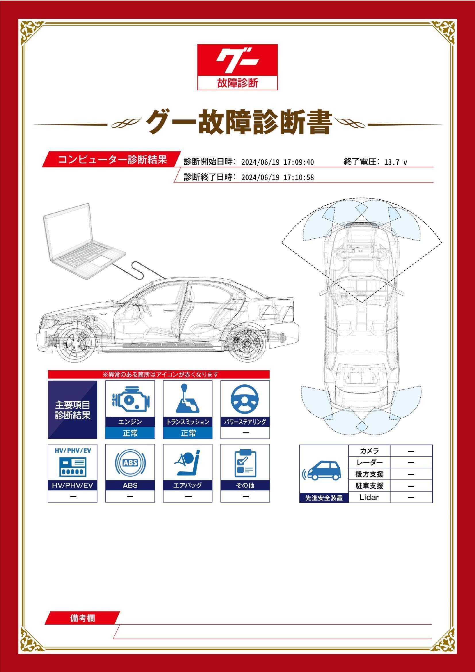 | 保証項目 | 3ヶ月・3000km以内ならエンジン、トランスミッション、ハイブリッド、ステアリング、ブレーキの各機構における主要項目を無償修理(または交換)いたします。 |