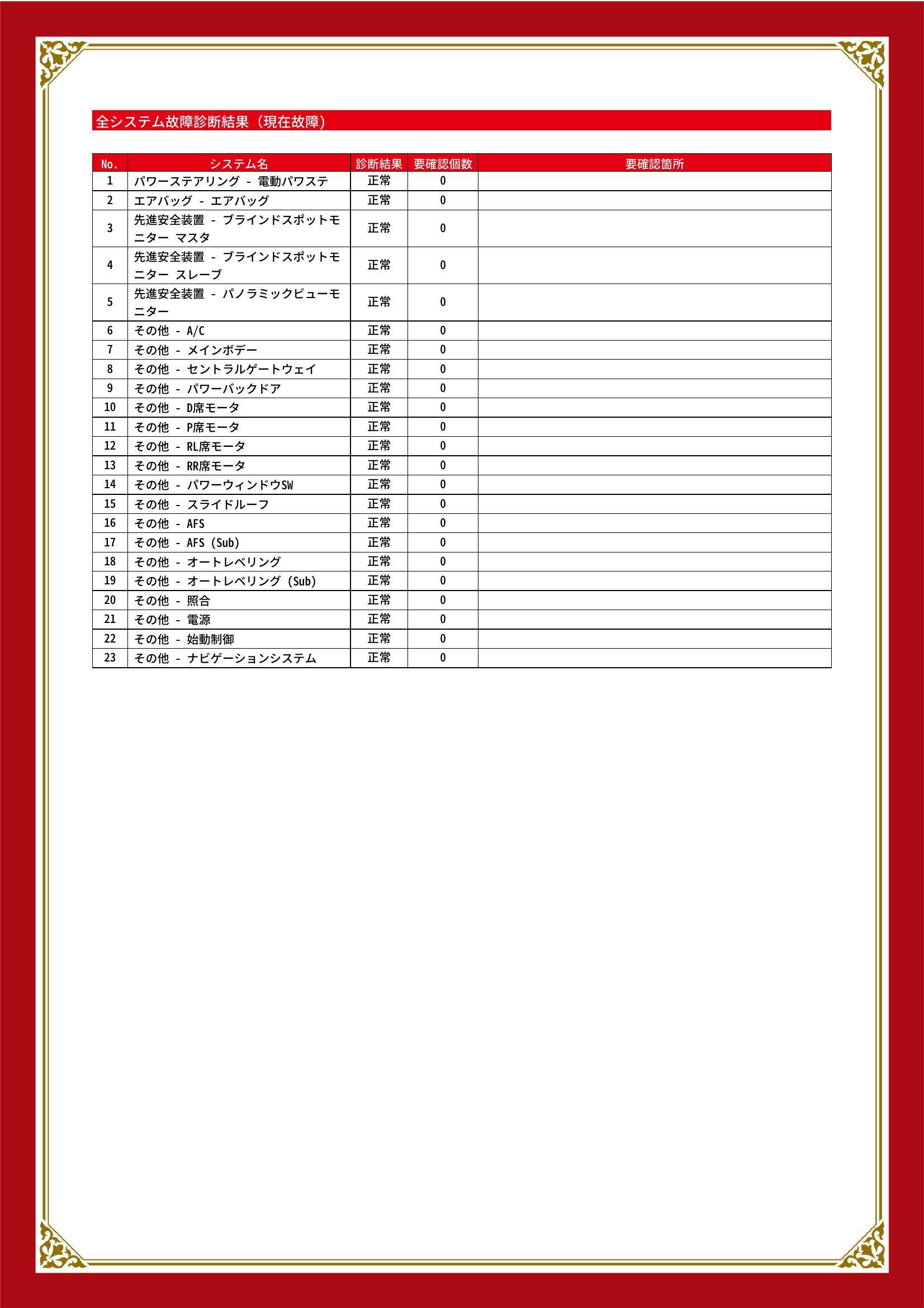 | 保証項目 | 3ヶ月・3000km以内ならエンジン、トランスミッション、ハイブリッド、ステアリング、ブレーキの各機構における主要項目を無償修理(または交換)いたします。 |