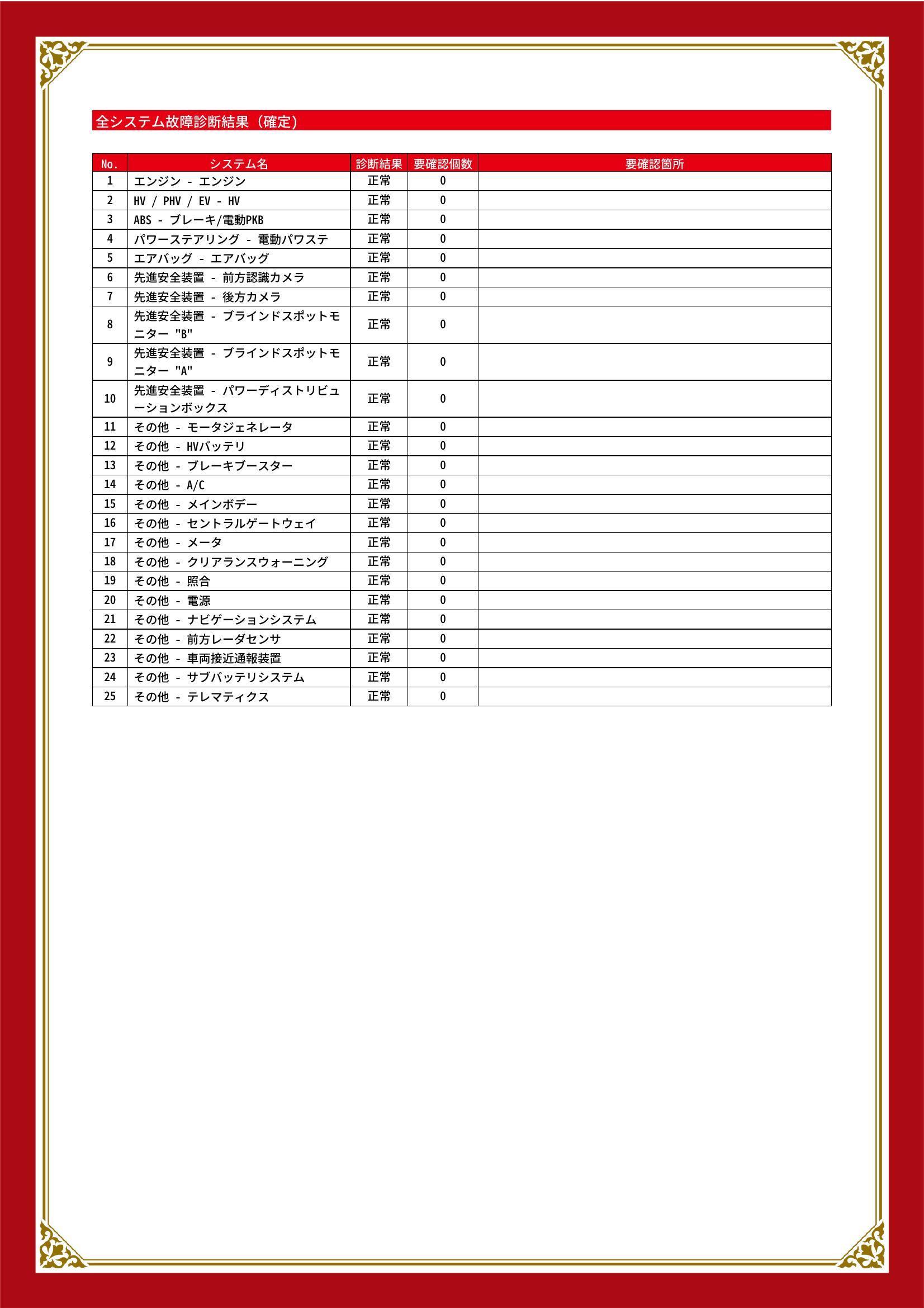 | 保証項目 | 3ヶ月・3000km以内ならエンジン、トランスミッション、ハイブリッド、ステアリング、ブレーキの各機構における主要項目を無償修理(または交換)いたします。 |