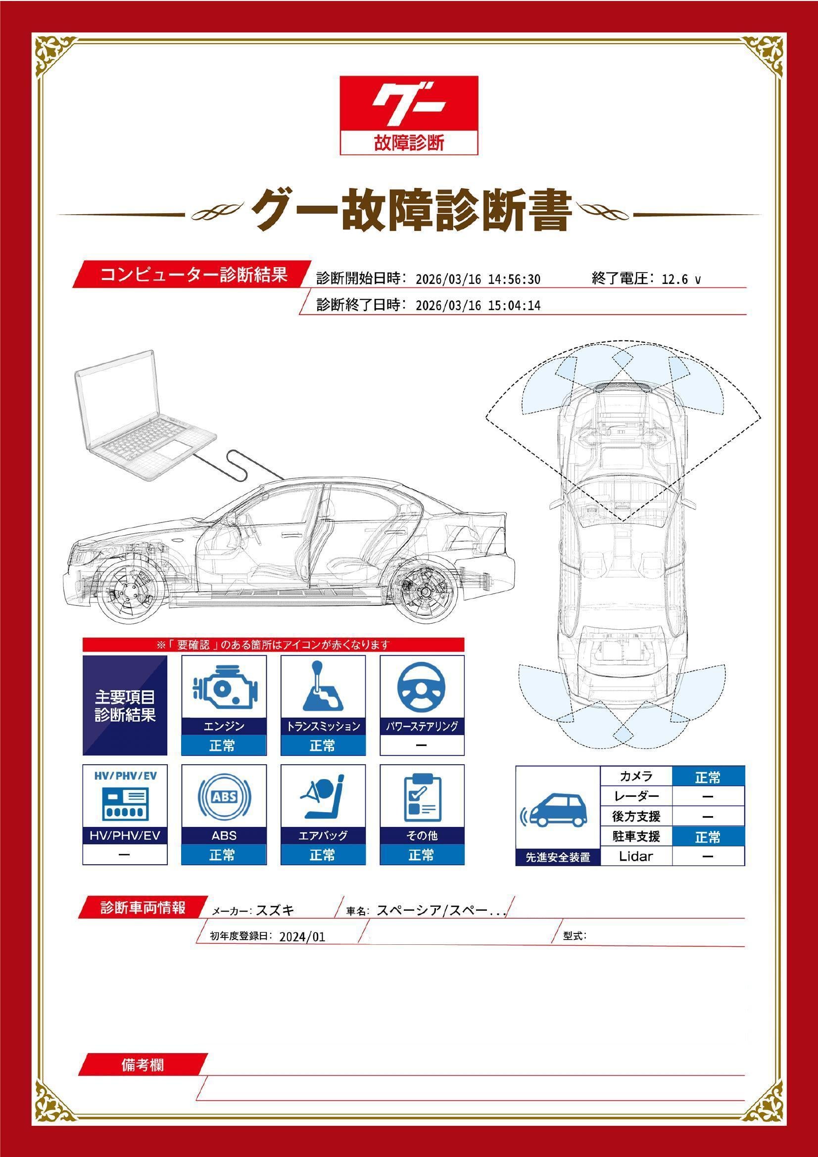 | 保証項目 | 3ヶ月・3000km以内ならエンジン、トランスミッション、ハイブリッド、ステアリング、ブレーキの各機構における主要項目を無償修理(または交換)いたします。 |
