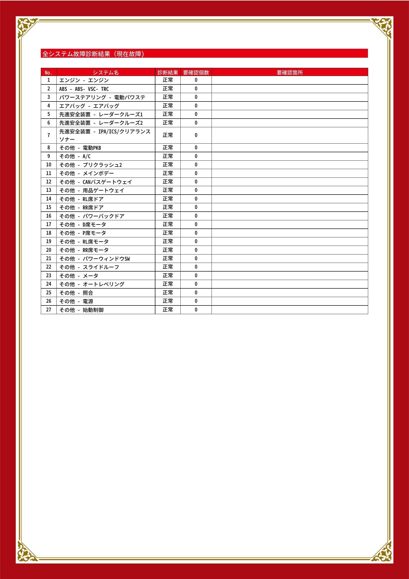 | 保証項目 | 3ヶ月・3000km以内ならエンジン、トランスミッション、ハイブリッド、ステアリング、ブレーキの各機構における主要項目を無償修理(または交換)いたします。 |