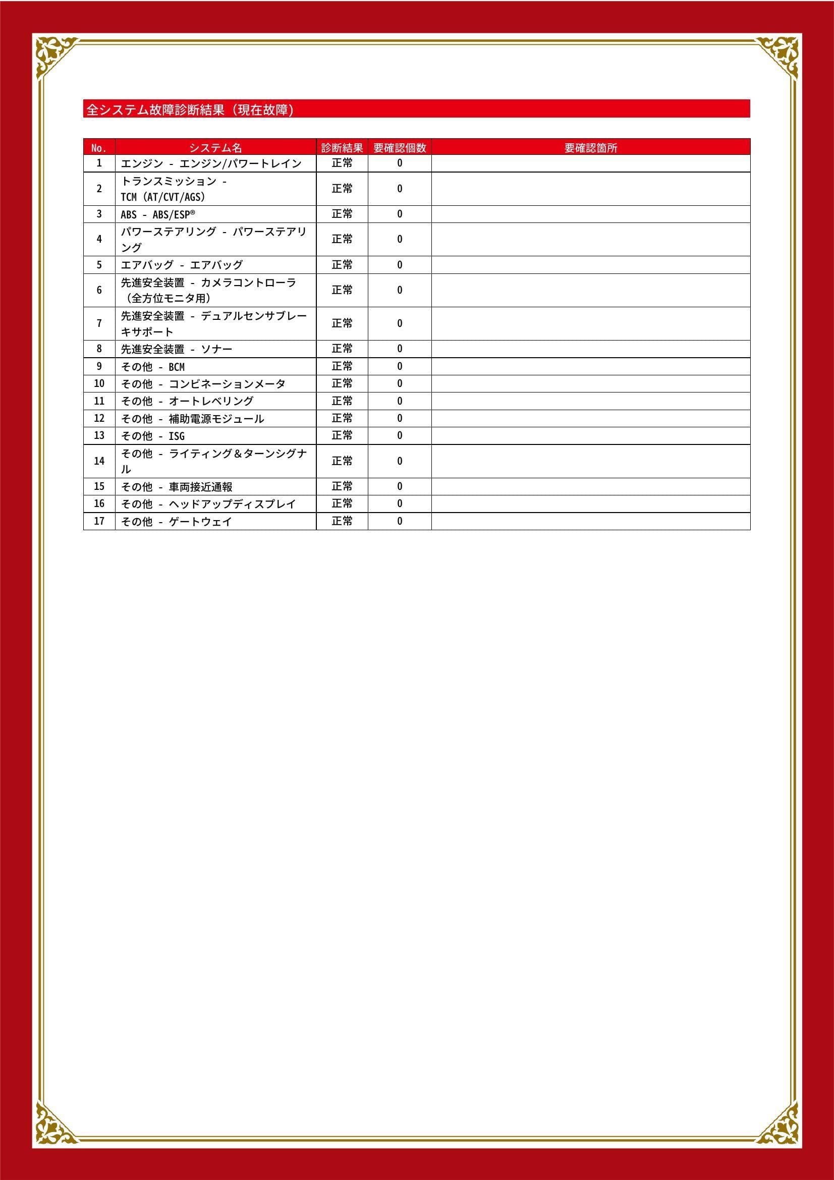 | 保証項目 | 3ヶ月・3000km以内ならエンジン、トランスミッション、ハイブリッド、ステアリング、ブレーキの各機構における主要項目を無償修理(または交換)いたします。 |