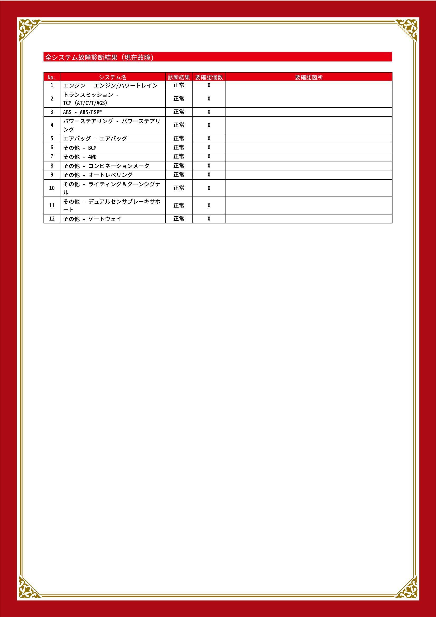 | 保証項目 | 3ヶ月・3000km以内ならエンジン、トランスミッション、ハイブリッド、ステアリング、ブレーキの各機構における主要項目を無償修理(または交換)いたします。 |