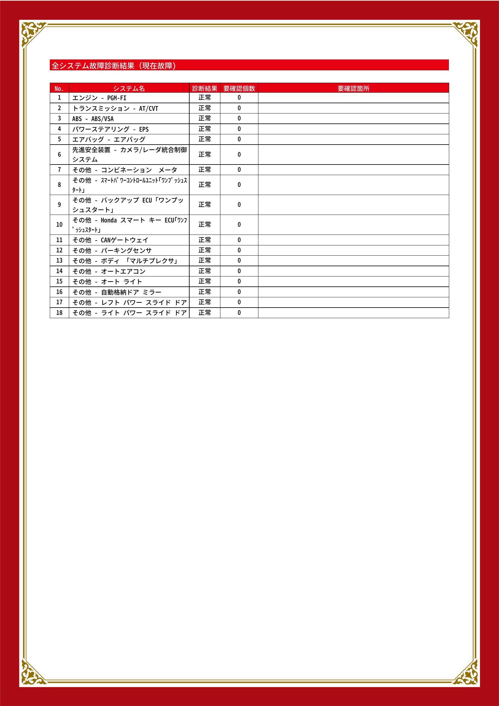 | 保証項目 | 3ヶ月・3000km以内ならエンジン、トランスミッション、ハイブリッド、ステアリング、ブレーキの各機構における主要項目を無償修理(または交換)いたします。 |
