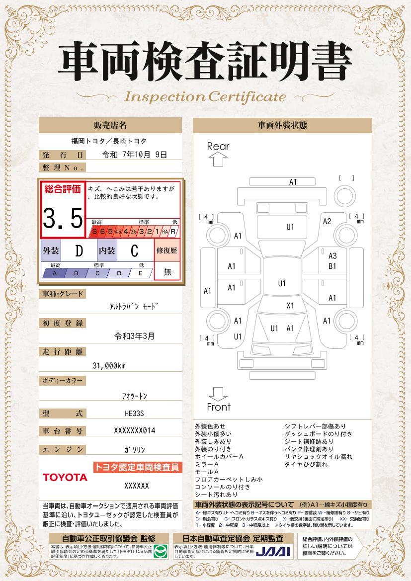 1.まるごとクリーニングエンジンルームからシートを外した洗浄まで、目に見えないところまで徹底的に洗浄しています。2.車両検査証明書中古車の総合評価や内外装の状態などをひと目で分かるよう、トヨタが認めたプロの検査員が実施した車両検査証明書をご用意しています。3.ロングラン保