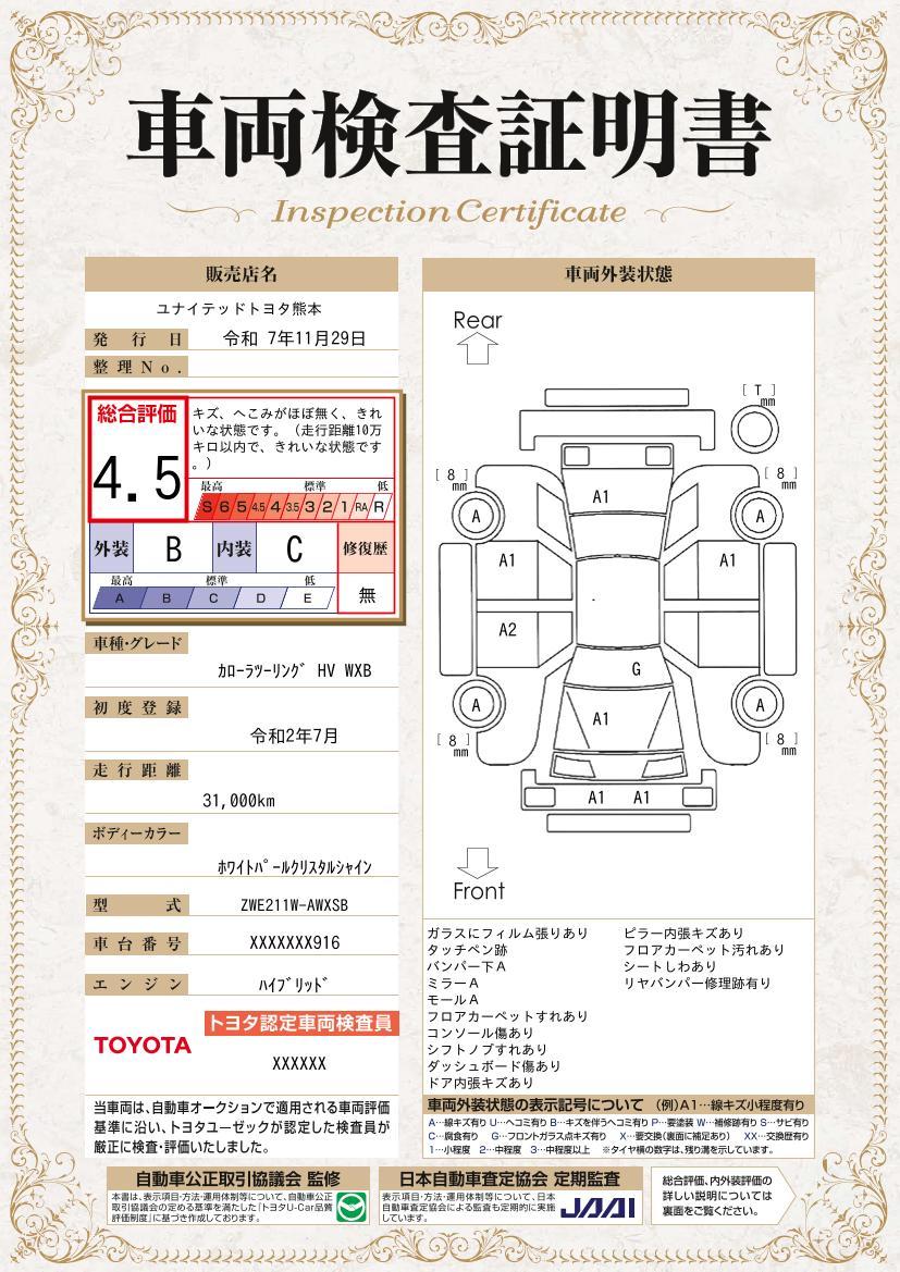 中古車は1台ずつコンディションが違います。トヨタでは中古車の総合評価や内外装の状態などをひと目で分かるよう、プロの検査員が実施した車両検査証明書をご用意しています。 36