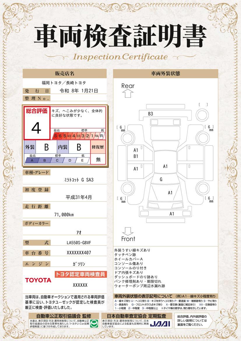 1.まるごとクリーニングエンジンルームからシートを外した洗浄まで、目に見えないところまで徹底的に洗浄しています。2.車両検査証明書中古車の総合評価や内外装の状態などをひと目で分かるよう、トヨタが認めたプロの検査員が実施した車両検査証明書をご用意しています。3.ロングラン保