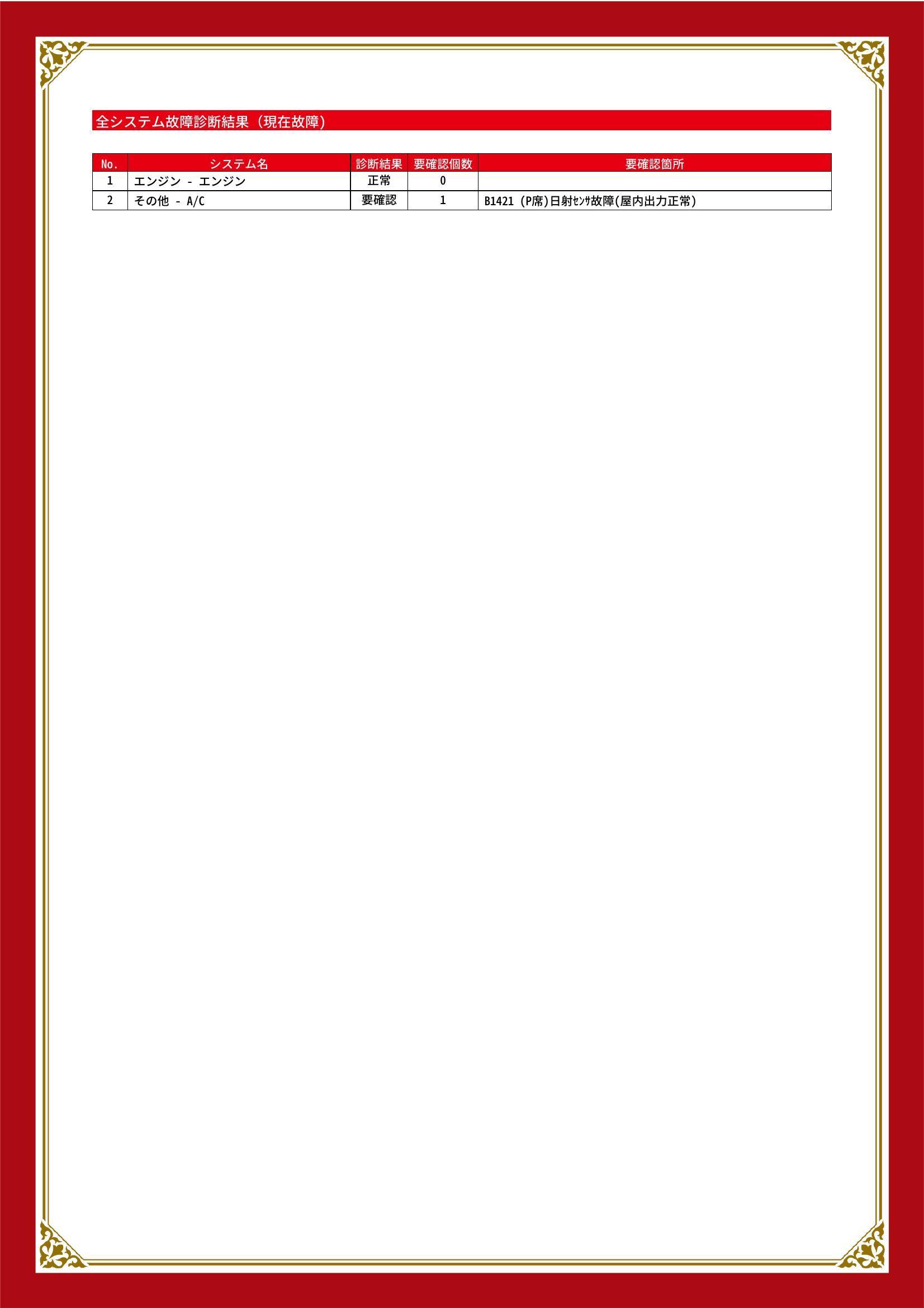 | 保証項目 | その他、スタンダード・プラチナ保証をご用意。【スタンダード・プラチナ保証】では対象項目が業界最高水準の400部位以上!消耗品以外は保証にてご対応出来ます。詳細は店舗へお問い合わせください! |