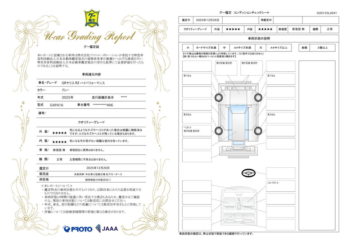 計260項目 保証項目につきましては、新車保証(メーカー保証)の内容と同じ(5年間の特別保証と3年間の一般保証)になります。新車保証の内容につきましては新車の保証書(メンテナンスノート)に記載してあります。 |