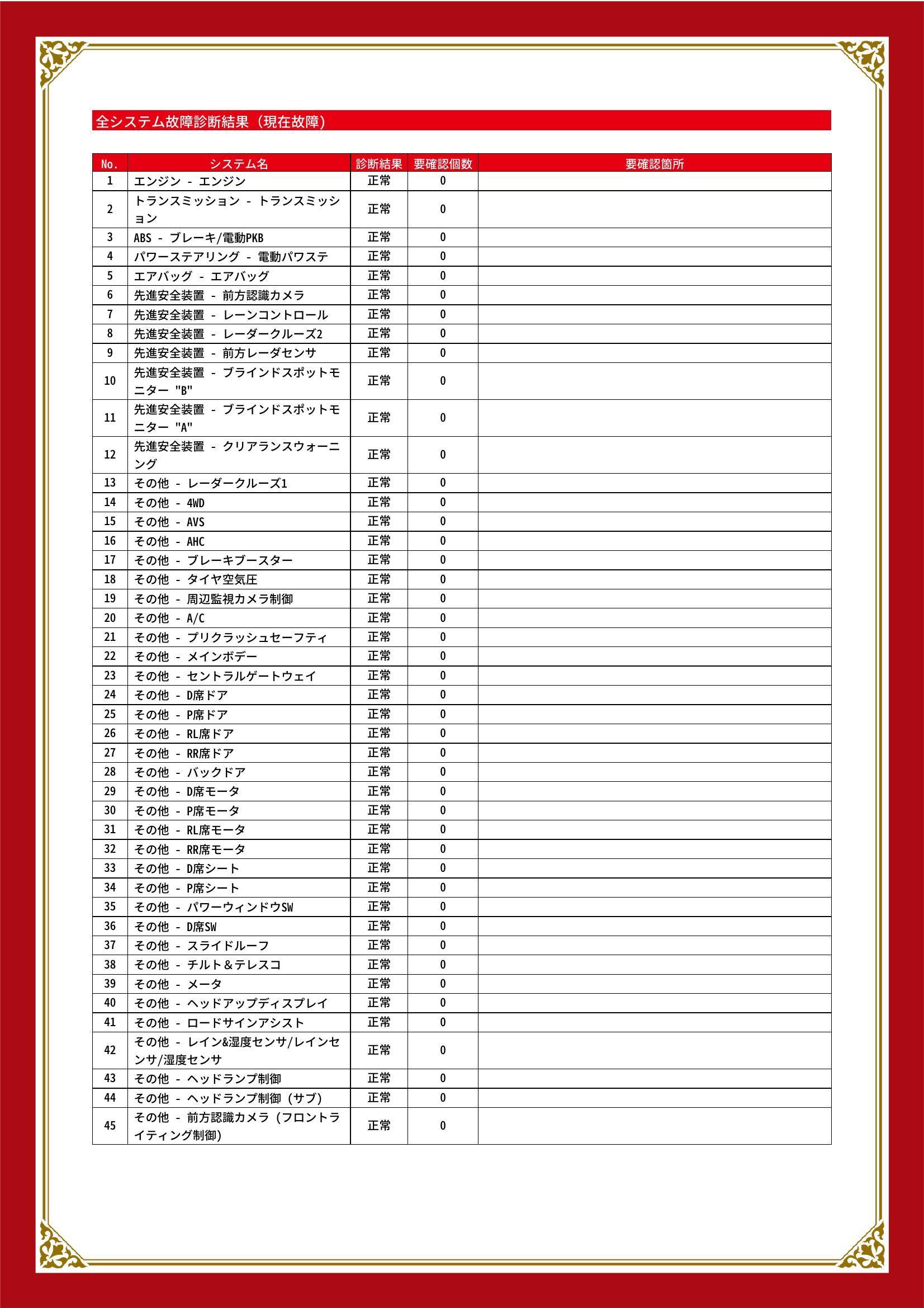| 保証項目 | 全車付帯の走行距離無制限、1年保証付き!またキズ・凹み鈑金保証を含む7つの保証サービスのご案内もご用意がございます。加えてメーカー保証期間内の対応、詳細については販売スタッフまでお尋ねください。 |