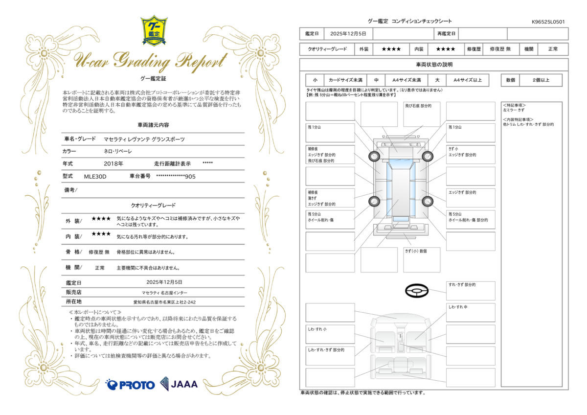 | 保証項目 | 【マセラティCPO認定中古車】イタリア本社指定121項目点検実施。認定中古車1年保証を無償付帯。 |