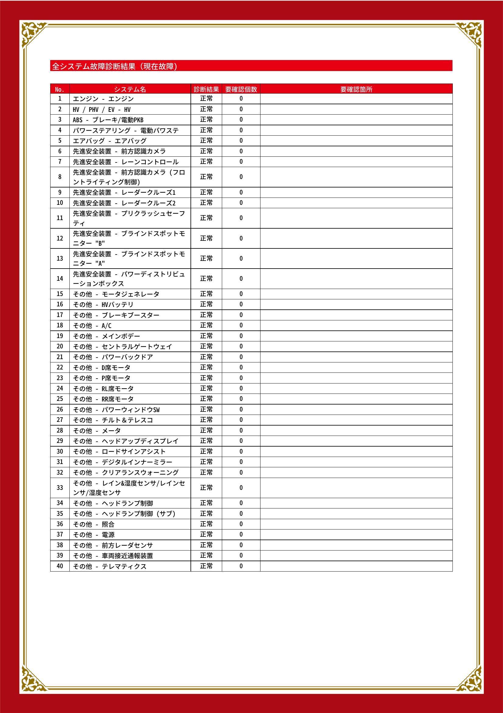 | 保証項目 | 3ヶ月・3000km以内ならエンジン、トランスミッション、ハイブリッド、ステアリング、ブレーキの各機構における主要項目を無償修理(または交換)いたします。 |