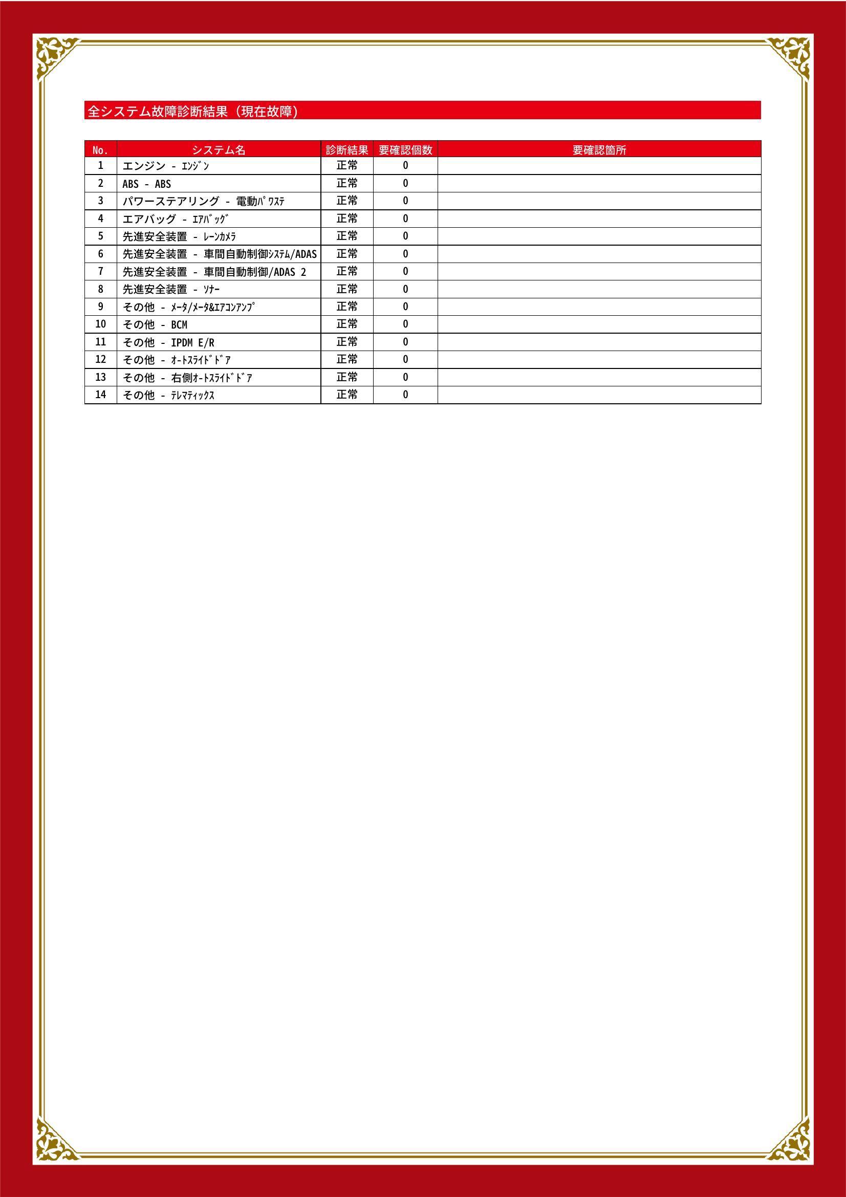 | 保証項目 | 3ヶ月・3000km以内ならエンジン、トランスミッション、ハイブリッド、ステアリング、ブレーキの各機構における主要項目を無償修理(または交換)いたします。 |