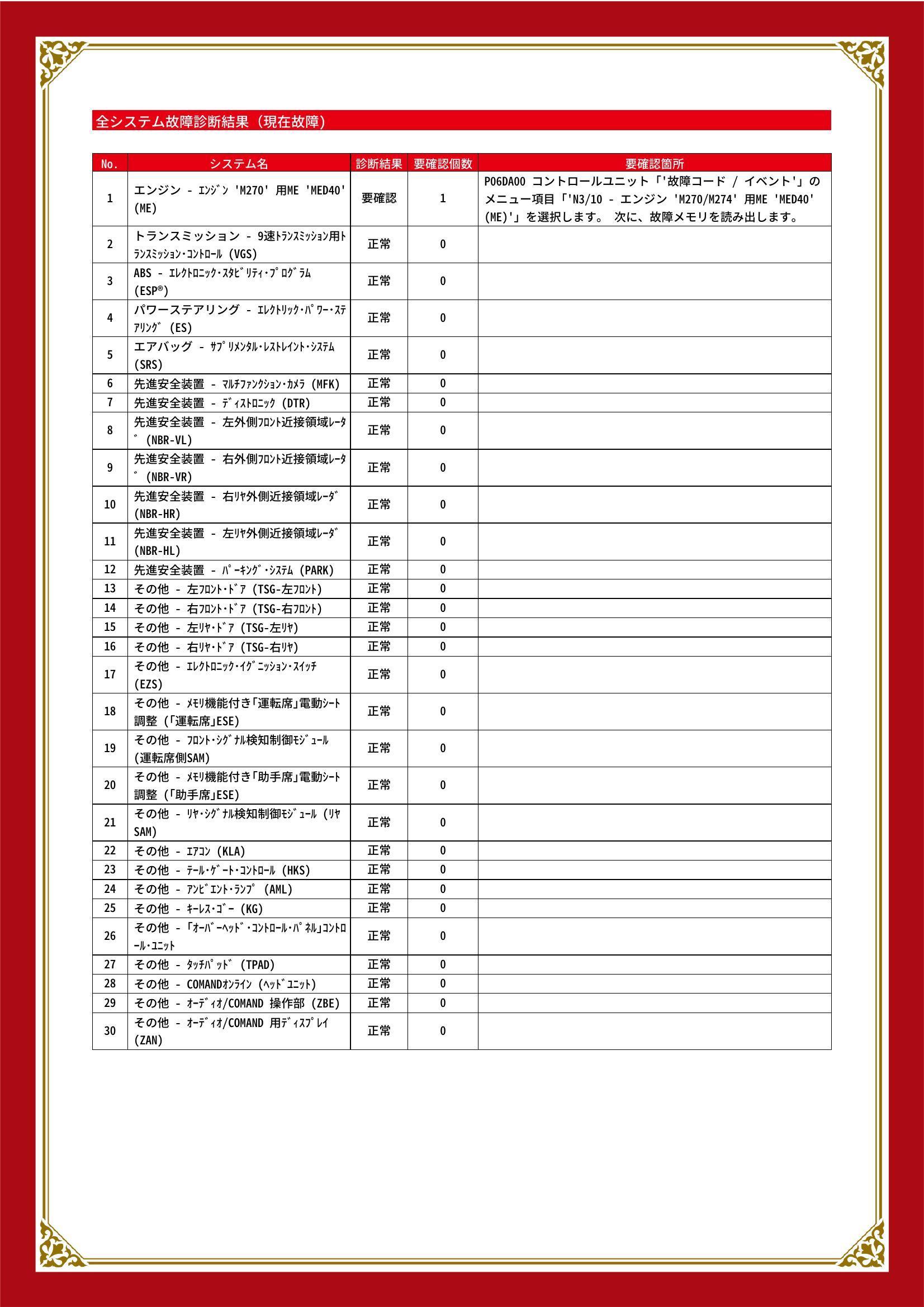 | 保証項目 | ■消耗品、油脂類、外装は保証対象外 全ての消耗部品の補充、交換に要する費用(例:ベルト類、ブレーキディスク・パッド、電球の交換等)は保証修理に含まれません |