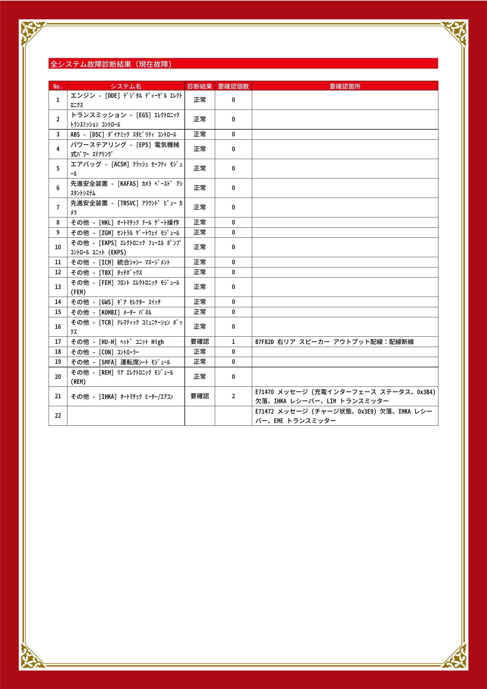 | 保証項目 | ■消耗品、油脂類、外装は保証対象外 全ての消耗部品の補充、交換に要する費用(例:ベルト類、ブレーキディスク・パッド、電球の交換等)は保証修理に含まれません |