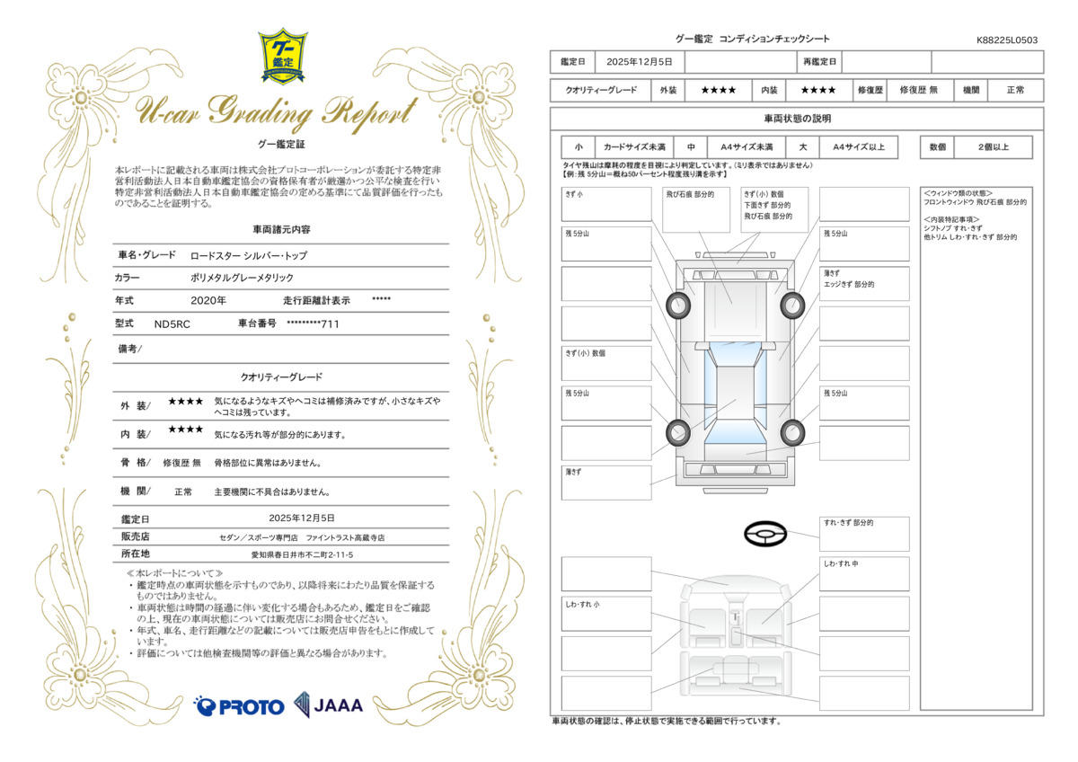 | 保証項目 | その他、スタンダード・プラチナ保証をご用意。【スタンダード・プラチナ保証】では対象項目が業界最高水準の400部位以上!消耗品以外は保証にてご対応出来ます。詳細は店舗へお問い合わせください! |