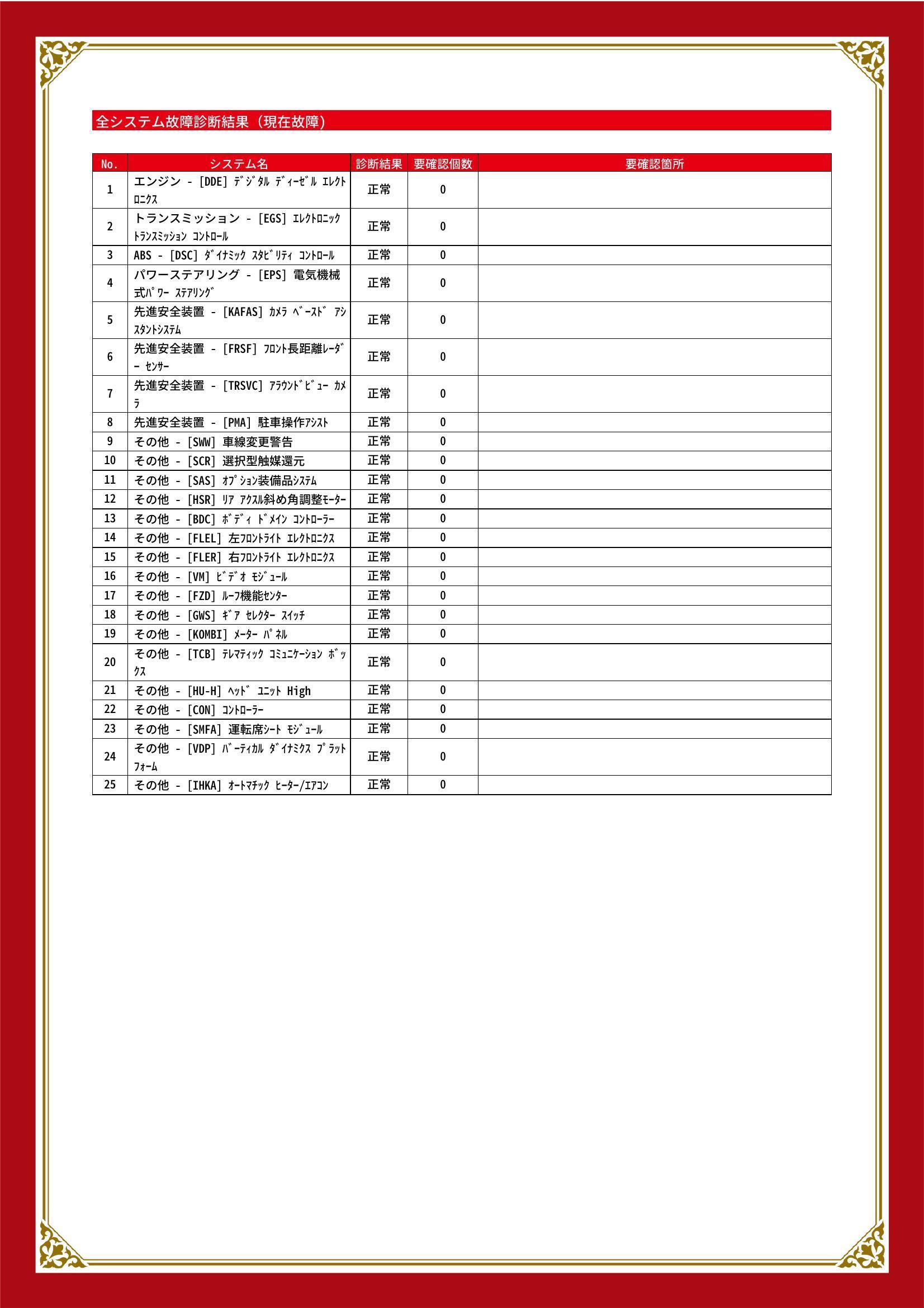 | 保証項目 | ■消耗品、油脂類、外装は保証対象外 全ての消耗部品の補充、交換に要する費用(例:ベルト類、ブレーキディスク・パッド、電球の交換等)は保証修理に含まれません |