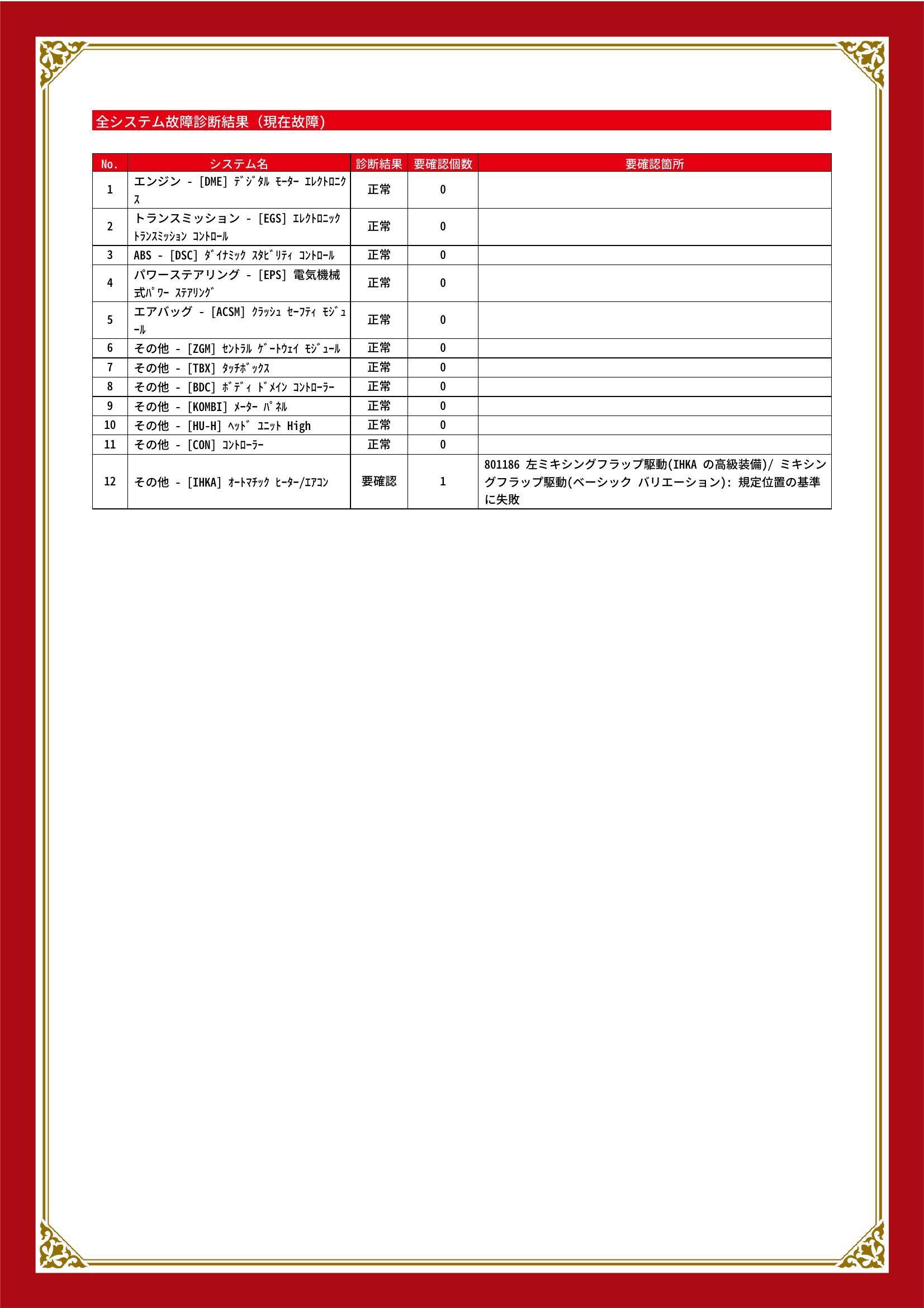 | 保証項目 | ■消耗品、油脂類、外装は保証対象外 全ての消耗部品の補充、交換に要する費用(例:ベルト類、ブレーキディスク・パッド、電球の交換等)は保証修理に含まれません |