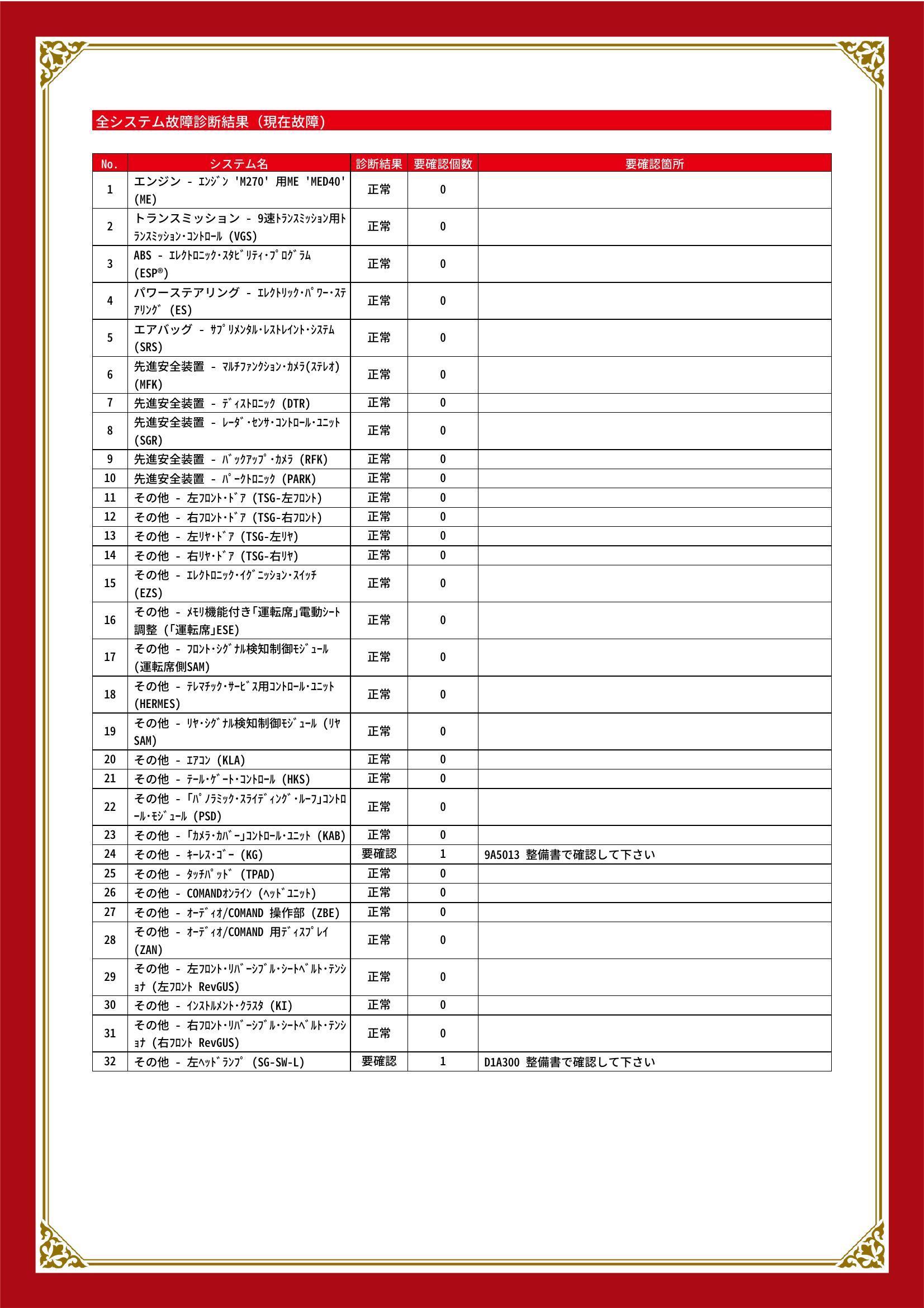 | 保証項目 | ■消耗品、油脂類、外装は保証対象外 全ての消耗部品の補充、交換に要する費用(例:ベルト類、ブレーキディスク・パッド、電球の交換等)は保証修理に含まれません |