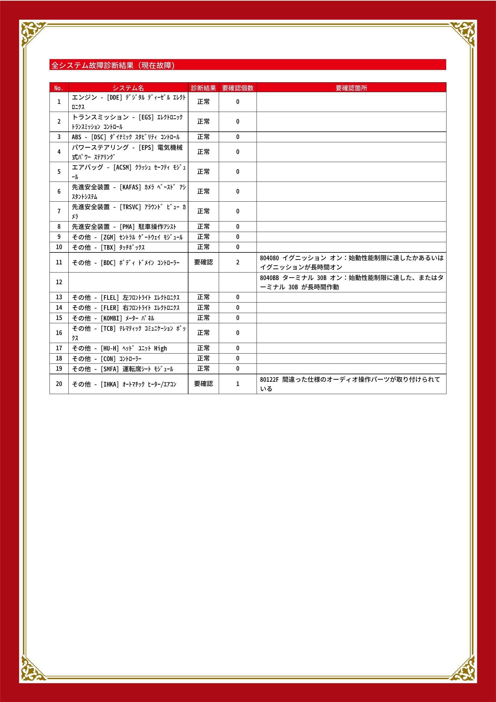 | 保証項目 | ■消耗品、油脂類、外装は保証対象外 全ての消耗部品の補充、交換に要する費用(例:ベルト類、ブレーキディスク・パッド、電球の交換等)は保証修理に含まれません |