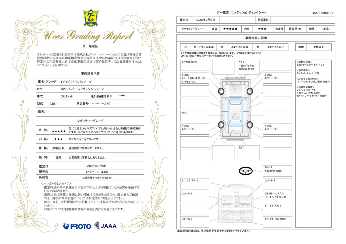 | 保証項目 | 3ヶ月・3000km以内ならエンジン、トランスミッション、ハイブリッド、ステアリング、ブレーキの各機構における主要項目を無償修理(または交換)いたします。 |