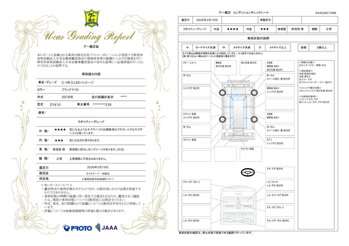 | 保証項目 | 3ヶ月・3000km以内ならエンジン、トランスミッション、ハイブリッド、ステアリング、ブレーキの各機構における主要項目を無償修理(または交換)いたします。 |