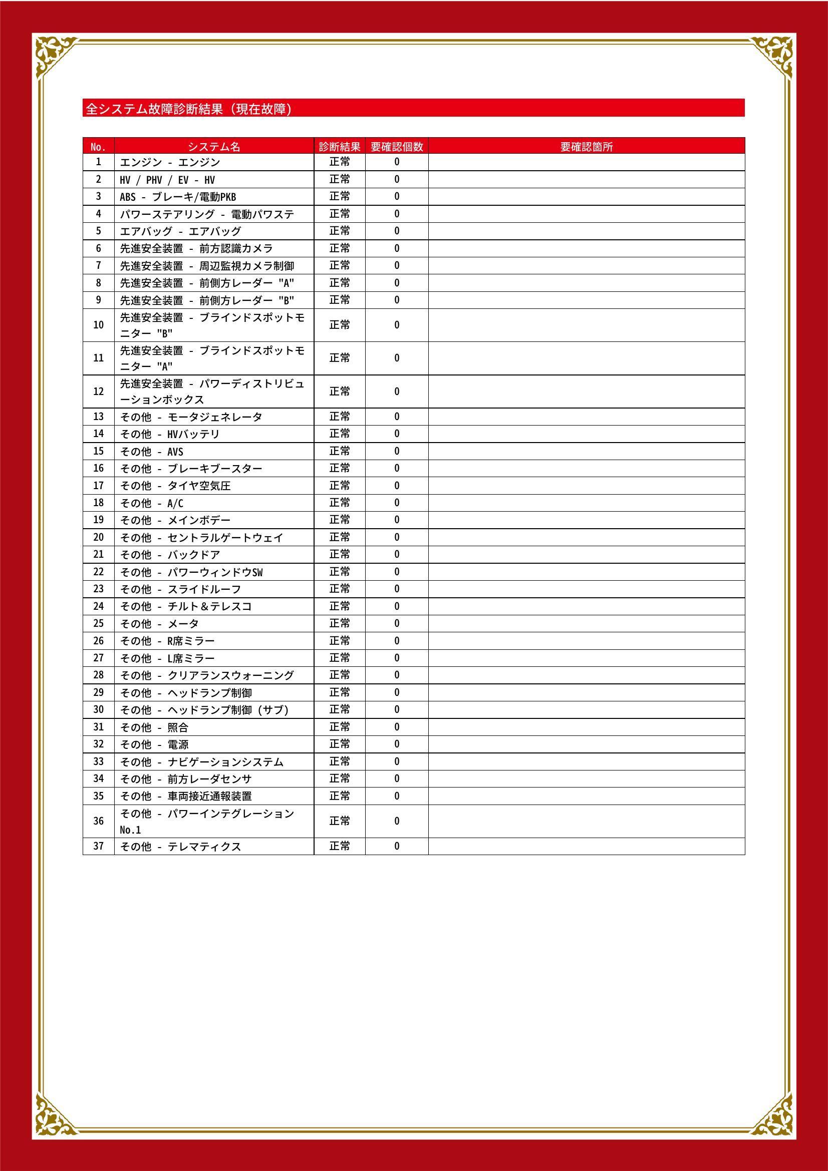 | 保証項目 | 3ヶ月・3000km以内ならエンジン、トランスミッション、ハイブリッド、ステアリング、ブレーキの各機構における主要項目を無償修理(または交換)いたします。 |