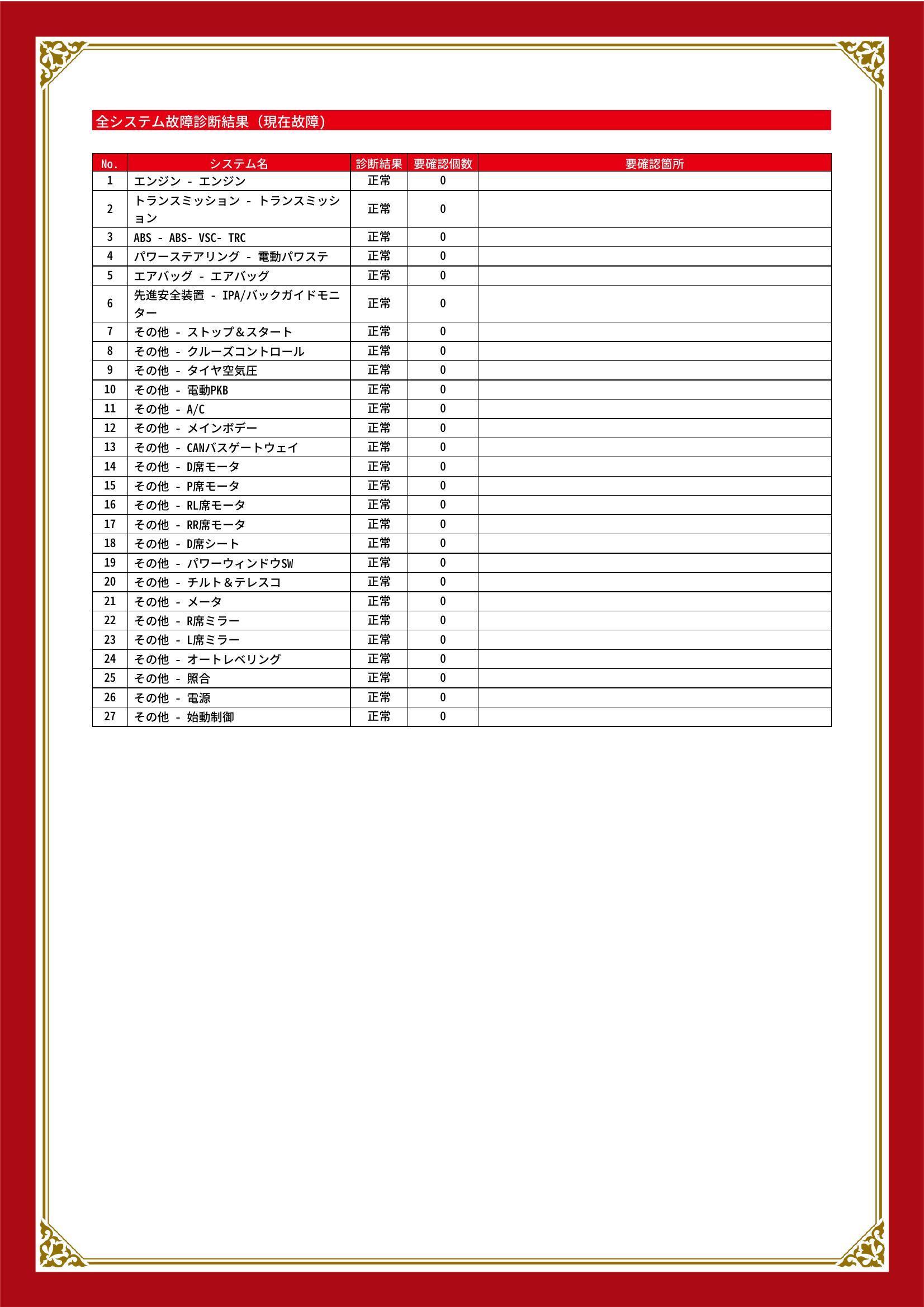 | 保証項目 | 3ヶ月・3000km以内ならエンジン、トランスミッション、ハイブリッド、ステアリング、ブレーキの各機構における主要項目を無償修理(または交換)いたします。 |