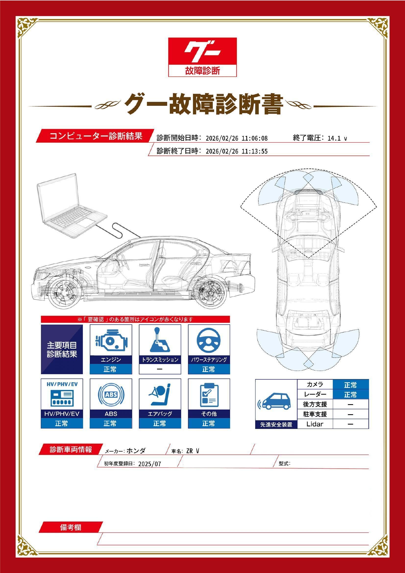 | 保証項目 | 3ヶ月・3000km以内ならエンジン、トランスミッション、ハイブリッド、ステアリング、ブレーキの各機構における主要項目を無償修理(または交換)いたします。 |